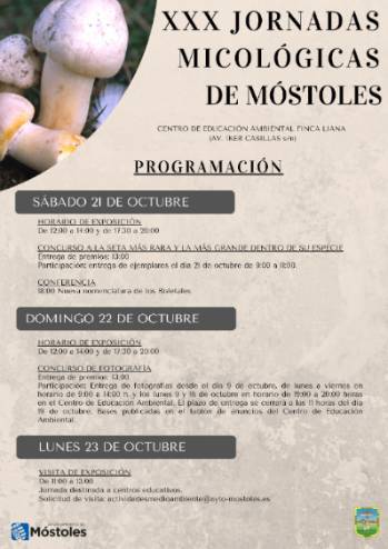 El Centro de Educación Ambiental Finca Liana acoge los días 21, 22 y 23 de octubre las XXX Jornadas Micológicas de Móstoles, organizadas por el Ayuntamiento de Móstoles, a través de la Concejalía de Seguridad, Emergencias, Movilidad y Medio Ambiente, en colaboración con la Sociedad Micológica de Móstoles.