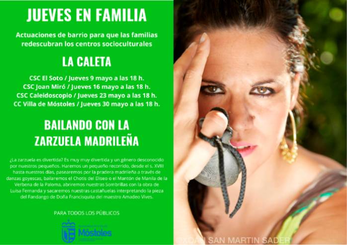Del 9 al 30 de mayo, los centros socioculturales de la ciudad acogen el espectáculo "Bailando con la zarzuela madrileña", representado por La Caleta, compañía local que nos invitan a un espectáculo para público familiar y participativo, con un recorrido de la Zarzuela desde el siglo XVIII hasta nuestros días.