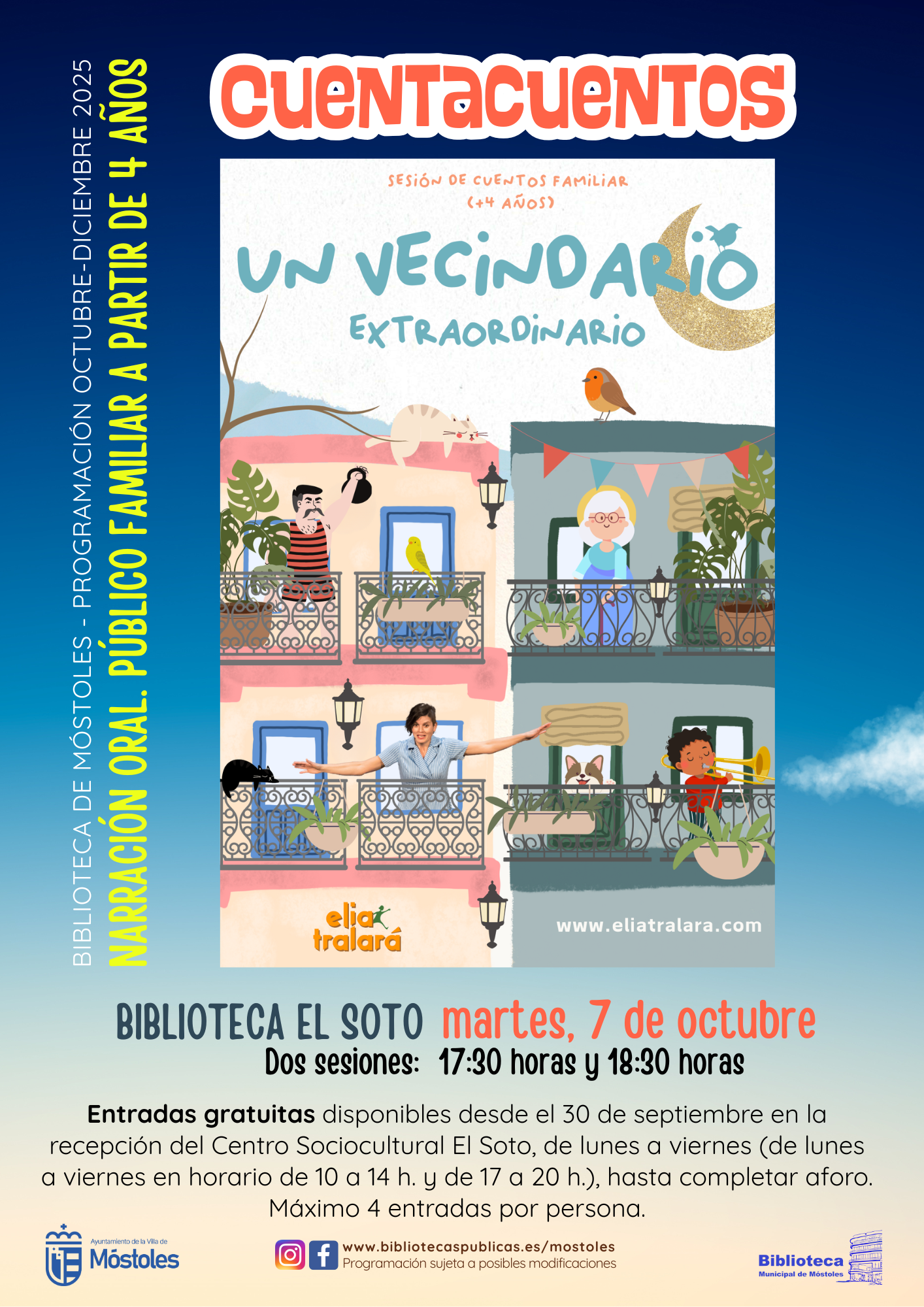 destacada agendadestacada agendaLa agenda cultural, diseñada por el Ayuntamiento de Móstoles, comienza esta semana con "Un vecindario extraordinario", un cuentacuentos a cargo de Elia Tralará, que tendrá lugar en el CSC El Soto el martes 7 de octubre a las 17:30 h y 18:30 h (dos sesiones de 30 minutos).