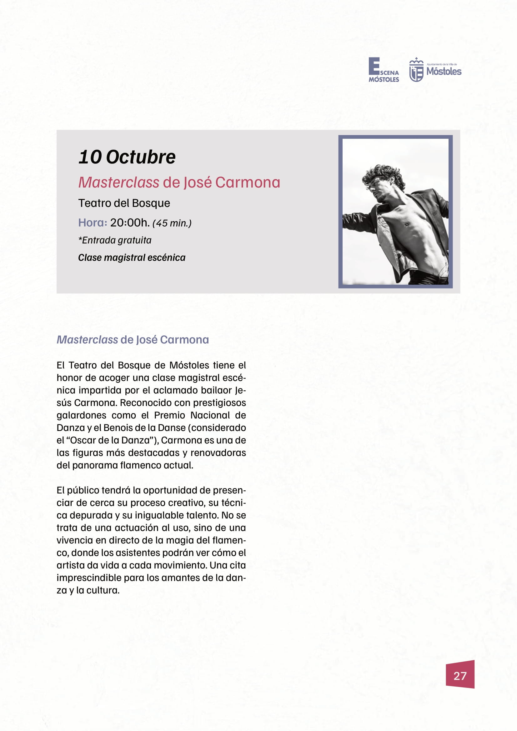 El Teatro del Bosque albergará el viernes 10, a las 20:00 h, una clase magistral escénica impartida por el bailaor Jesús Carmona. Reconocido con prestigiosos galardones como el Premio Nacional de Danza y el Benois de la Danse (considerado el «Oscar de la Danza»), Carmona es una de las figuras más destacadas y renovadoras del panorama flamenco actual. No se trata de una actuación al uso, sino de una vivencia en directo de la magia del flamenco, donde los asistentes podrán ver cómo el artista da vida a cada movimiento. Una cita imprescindible para los amantes de la danza y la cultura.