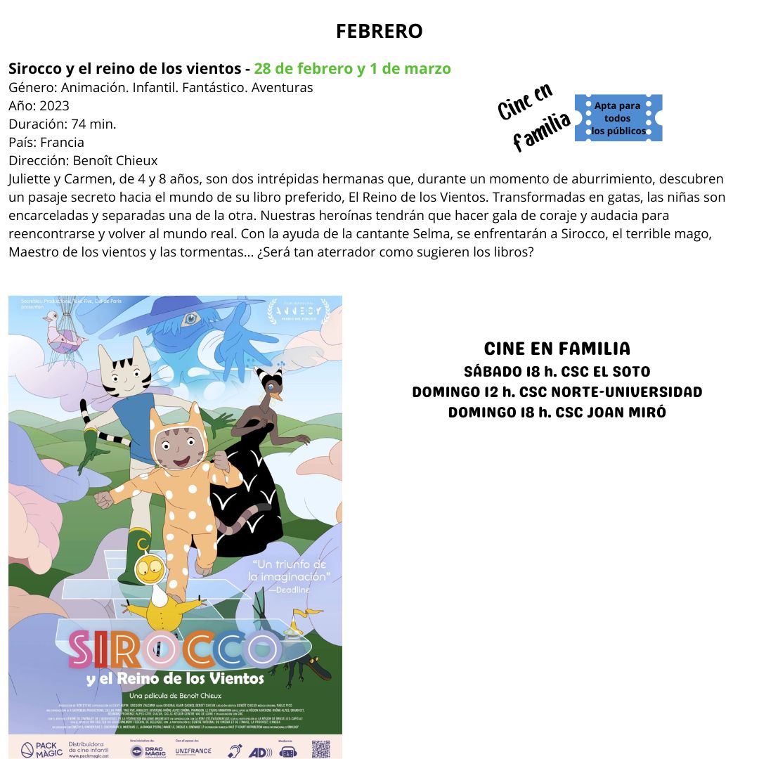 "Sirocco y el reino de los vientos", proyección gratuita dentro de Cine en familia, en el Centro Sociocultural Norte-Universidad a las 12:00 horas, y en el Centro Sociocultural Joan Miró a las 18:00 horas. Para todos los públicos. Retirada de invitaciones desde el lunes en el propio centro, de 10 a 14 y de 17 a 20 horas.