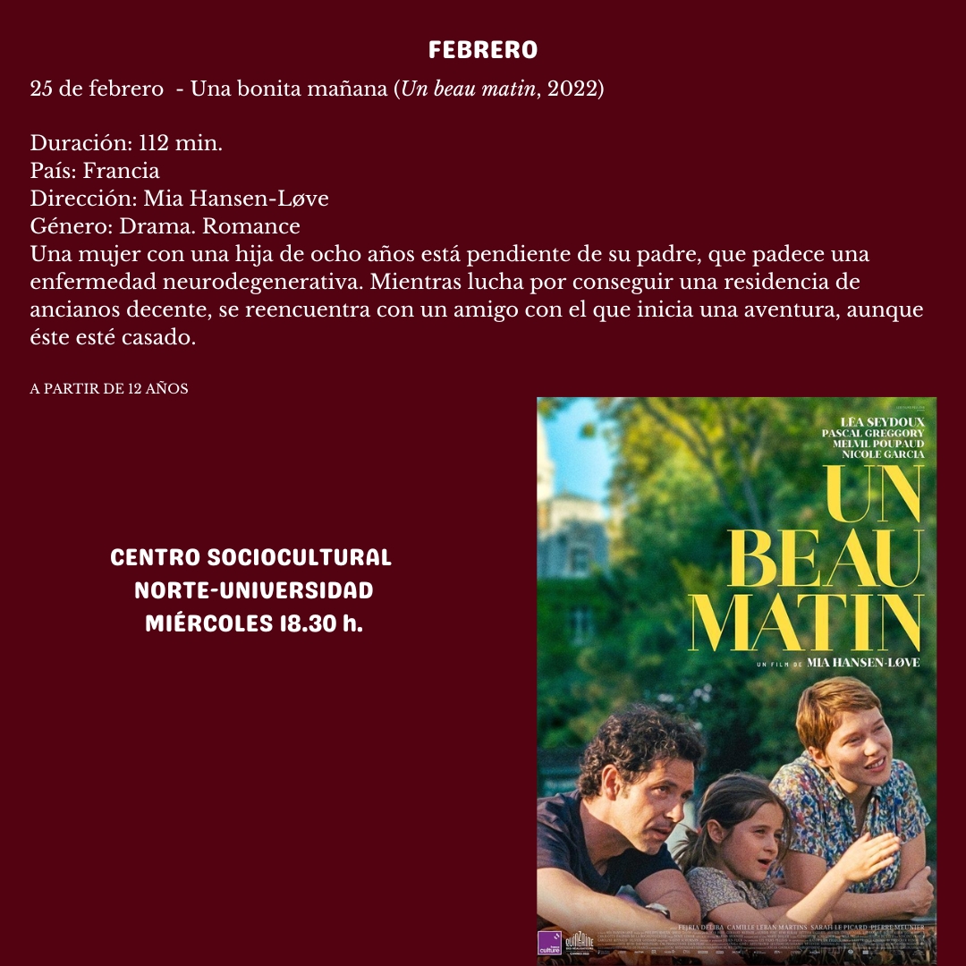 "Una bonita mañana (Un beau matin, 2022)", proyección de la película dentro del ciclo Filmoteca, en el Centro Sociocultural Norte-Universidad a las 18:30 horas. Entrada gratuita previa retirada de invitaciones en el propio centro desde el lunes 23 de febrero.