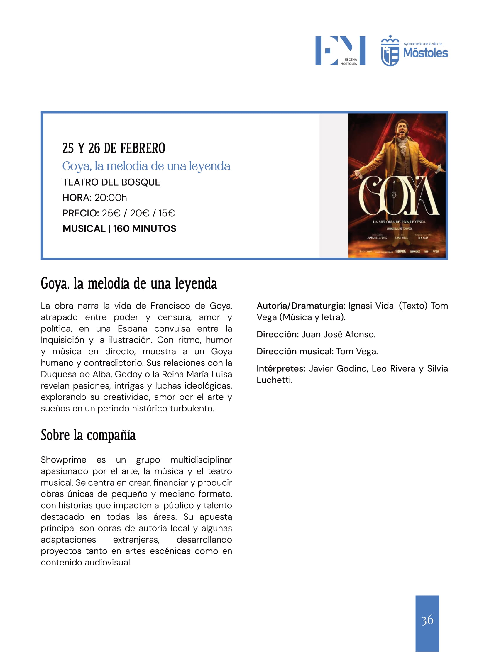 "Goya, la melodía de una leyenda", musical a cargo de la compañía Showprime, en el Teatro del Bosque a las 20:00 horas. Precio: 25, 20 y 15 €. 160 minutos. Para todos los públicos. Venta de entradas online o en taquillas de los teatros municipales.