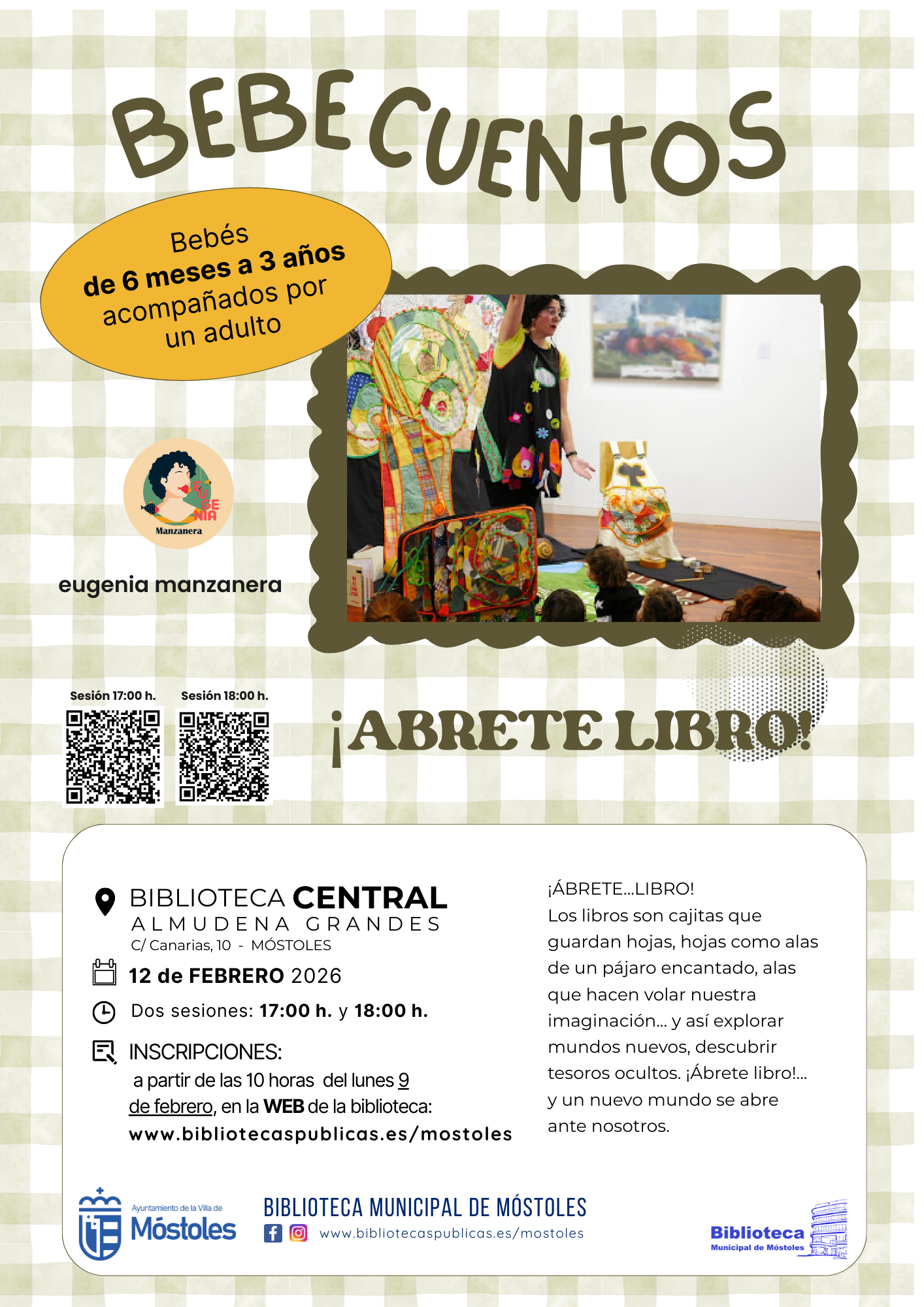 "¡Ábrete…Libro!", BebeCuentos a cargo de Eugenia Manzanera, en la Biblioteca Central a las 17:00 y 18:00 horas (2 sesiones de 30 minutos). Para niños de 6 meses a 3 años acompañados de un adulto. Entrada gratuita previa inscripción de invitaciones desde el lunes 9 de febrero a partir de las 10:00 horas en la web de la biblioteca: www.bibliotecaspublicas.es/mostoles