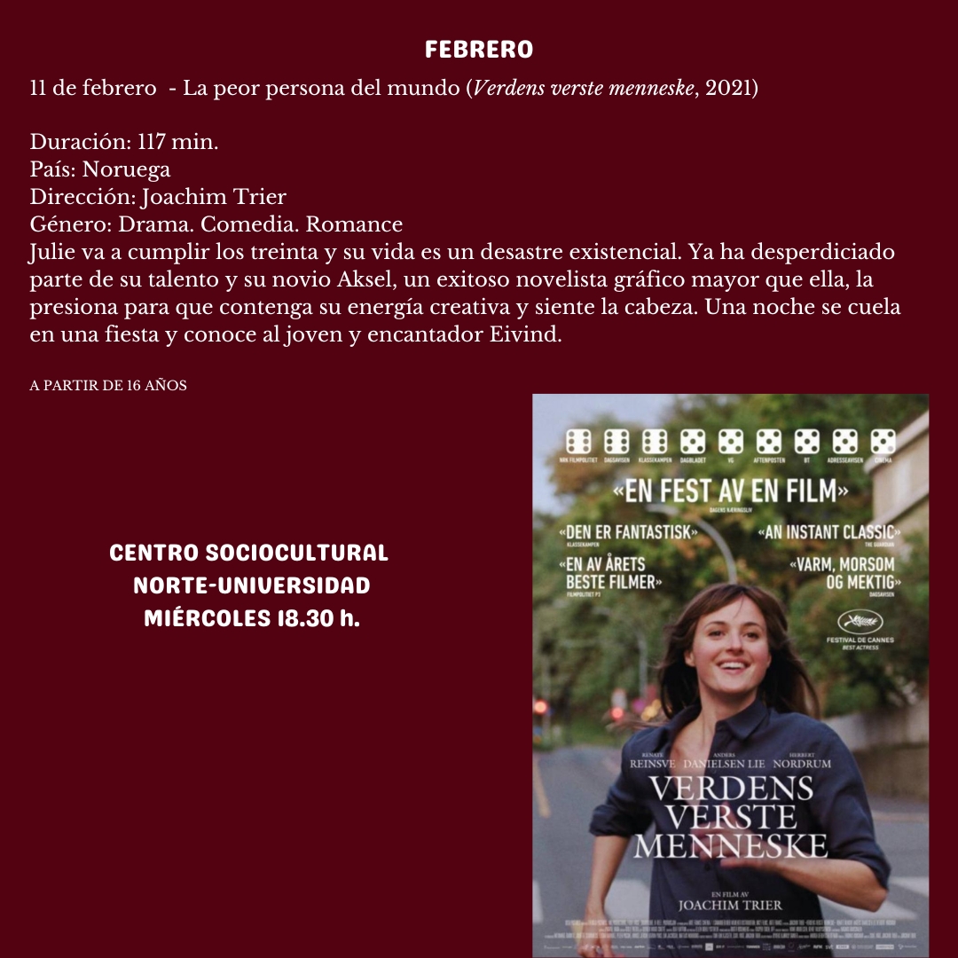"La peor persona del mundo (Verdens verste menneske, 2021)", proyección de la película dentro del ciclo Filmoteca de Móstoles, en el Centro Sociocultural Norte-Universidad a las 18:30 horas. Entrada gratuita previa retirada de invitaciones en el propio centro desde el lunes 9 de febrero.