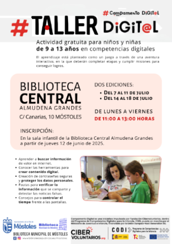 El Ayuntamiento de Móstoles organiza en la Biblioteca Central, un taller gratuito de competencias digitales para niños de 9 a 13 años, en colaboración con la Fundación Cibervoluntarios, durante el mes de julio.