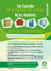 Para aquellas personas que no pueden desplazarse a los Puntos Limpios existe el SERVICIO MUNICIPAL DE RECOGIDA DE MUEBLES Y ENSERES: