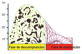 - Fase de maduración: durante este proceso se degrada la parte más difícil de biodegradar de la materia orgánica, disminuyendo lentamente la temperatura, gracias a la colonización de microorganismos especialmente dedicados a biodegradar estos elementos.