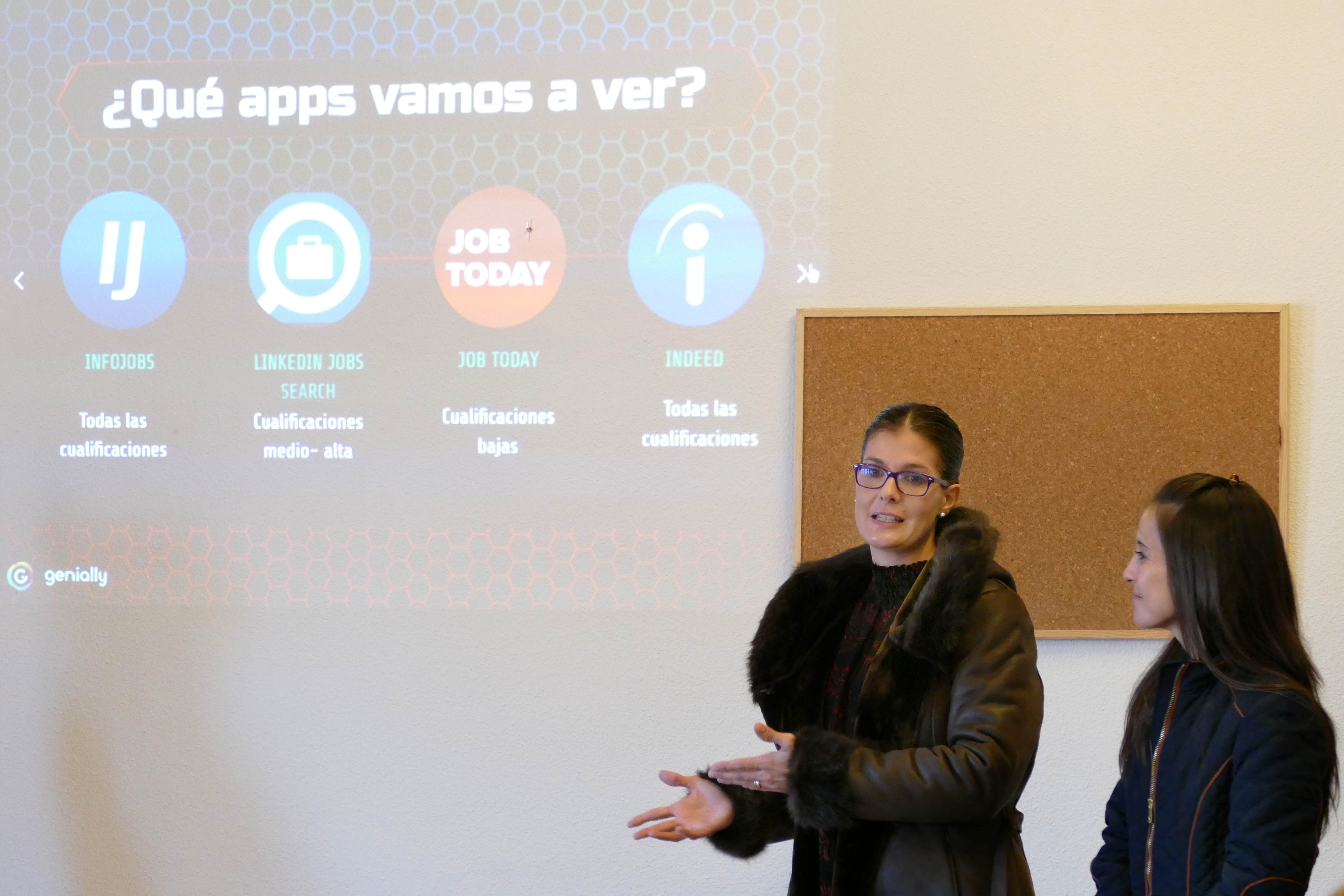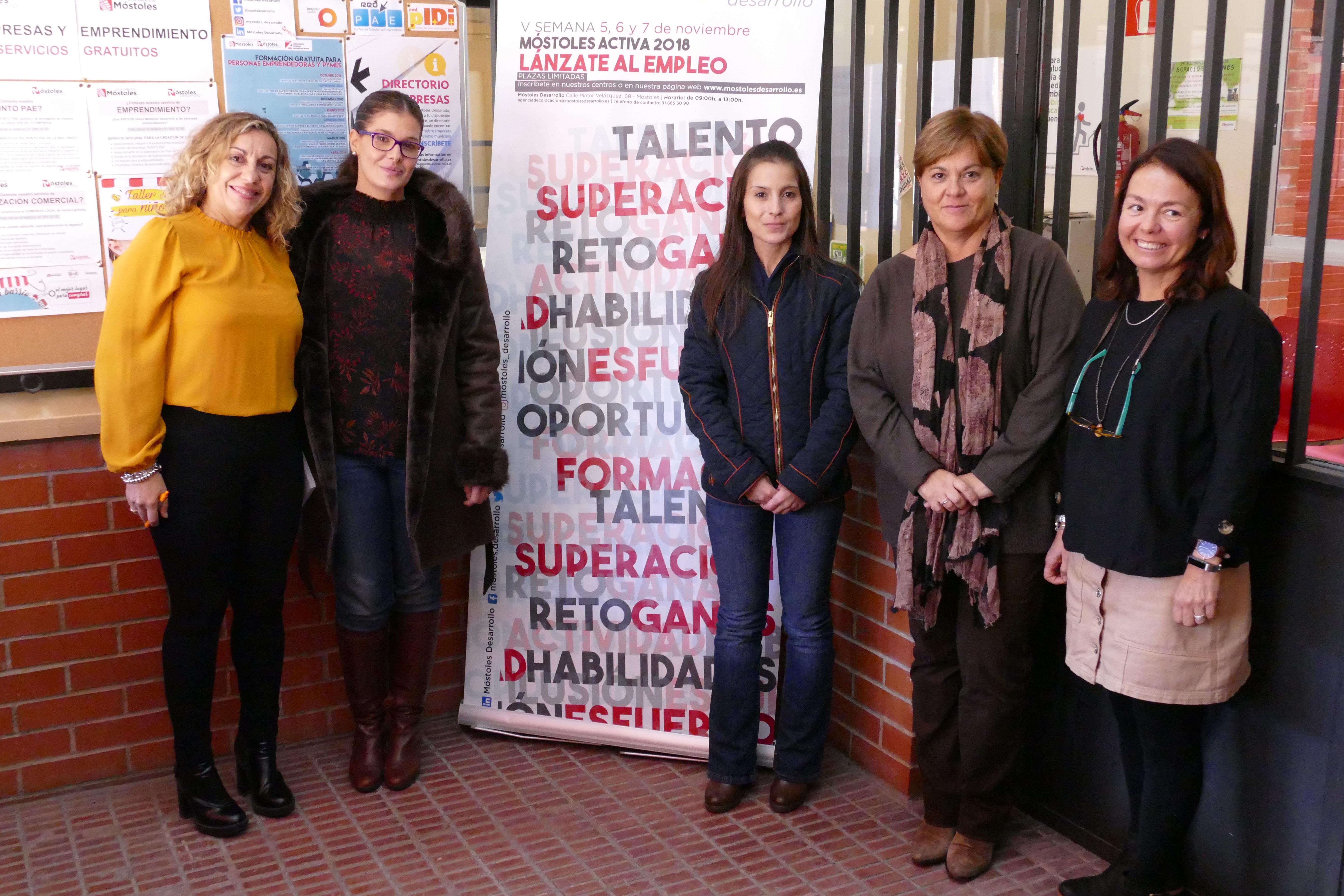 Los 20 participantes en los talleres sobre habilidades para el empleo que se celebraron ayer en la segunda jornada recibieron la visita de la alcaldesa de Móstoles, Noelia Posse, acompañada de la concejala de Desarrollo Económico, Empleo y Nuevas Tecnologías, Jessica Antolín.