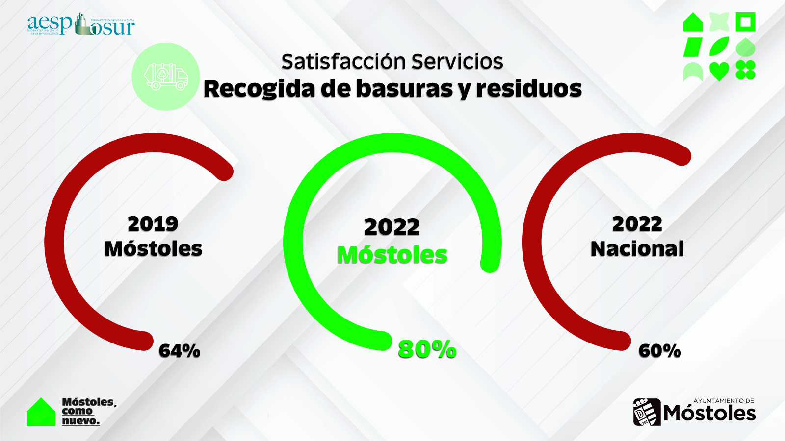 La recogida de basuras de Móstoles ha recibido un 80% de opiniones favorables. Esto supone 20 puntos porcentuales más que la media nacional y un 16% más que en 2019. Lo que más valoran los ciudadanos es la frecuencia de la recogida de basuras, seguido de la dotación de medios y el equipamiento para la prestación del servicio de recogida de basura y residuos.