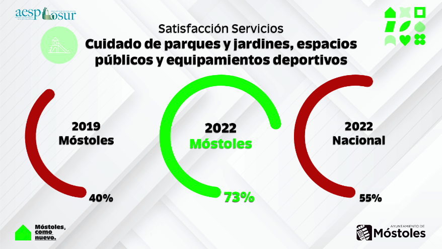 La encuesta refleja también un aumento de 33 puntos en el porcentaje de vecinas y vecinos satisfechos con el cuidado de parques y jardines, la conservación de espacios públicos y equipamientos deportivos. Móstoles supera el notable con un 73% de satisfacción entre los encuestados.