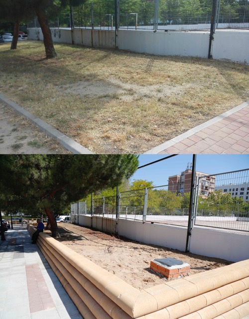 De esta forma, se ha modificado el parque, ajardinando la zona terriza junto al Parque de las Brigadas Internacionales y dicho paso de carruajes, aumentando el número de árboles en este espacio que servirán de pantalla acústica, mejorando de manera visible el entorno.