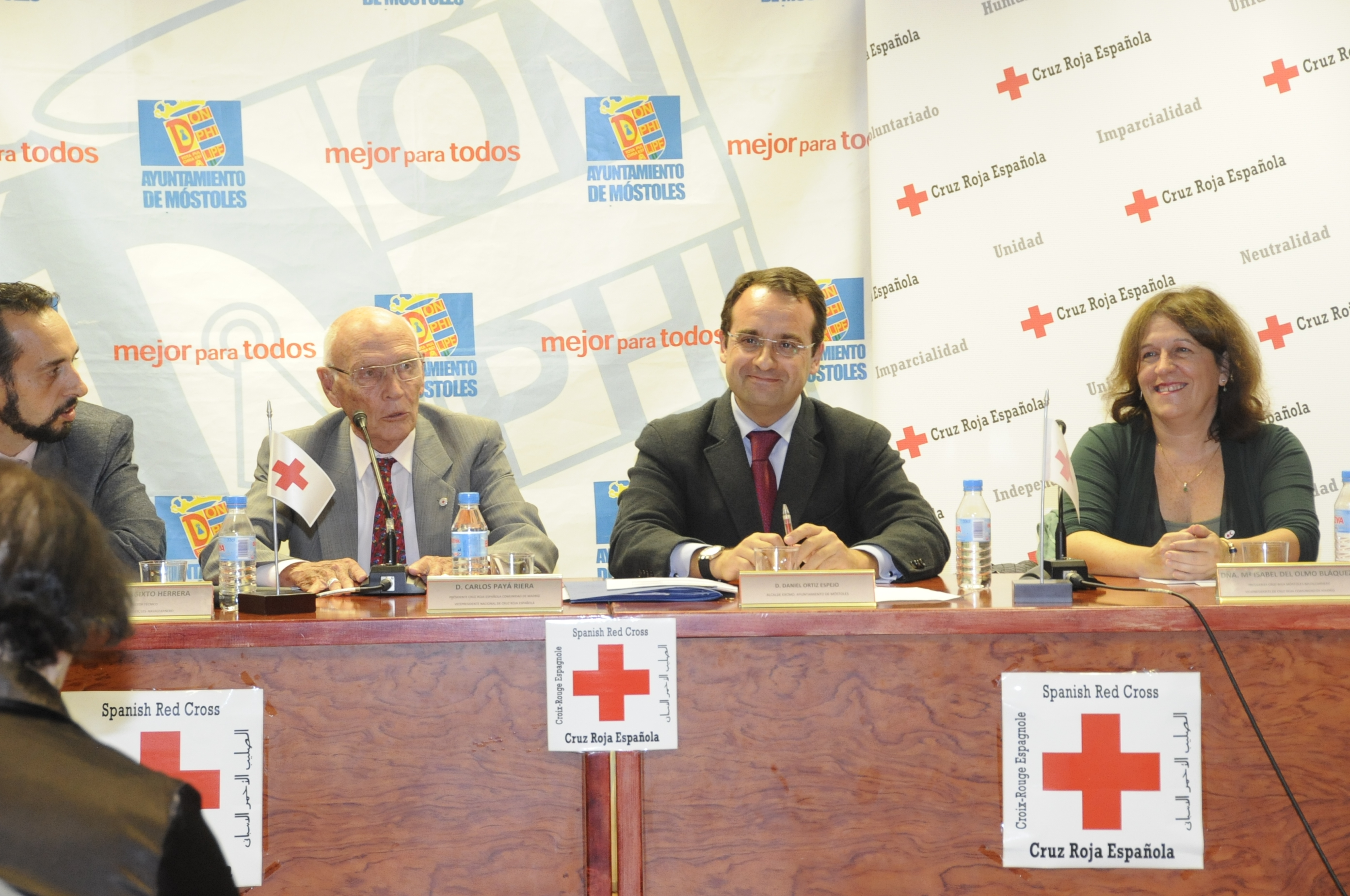 El Alcalde de Móstoles, Daniel Ortiz, junto al Presidente de Cruz Roja en Madrid, Carlos Payá, y la Presidenta de Cruz Roja en Móstoles, María Isabel del Olmo, han inaugurado el I Foro de Promoción del Cambio Social, organizado por esta institución en colaboración con el Ayuntamiento. La Concejal de Familia y Bienestar Social, Gema Zamorano, y la Concejal de Comunicación e Información al Ciudadano, Irene Gómez, han acompañado al regidor en este acto de presentación.
