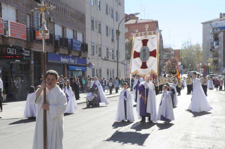 La Procesión del Encuentro, la más antigua de las procesiones de la ciudad y declarada de Interés Turístico Regional por la Comunidad de Madrid, ha cerrado hoy Domingo de Resurrección la programación de la Semana Santa de Móstoles.