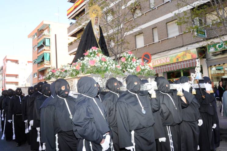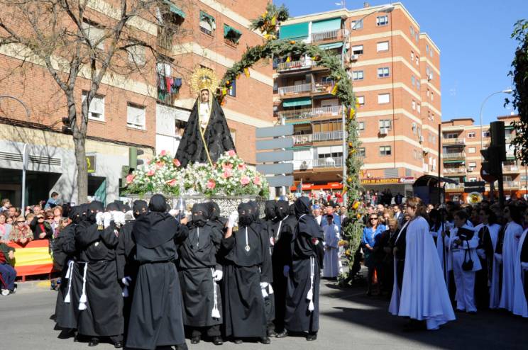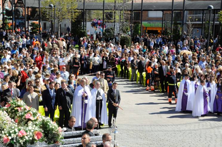 Con la asistencia del Alcalde, Daniel Ortiz, acompañado de varios concejales del Gobierno municipal, un año más los mostoleños han disfrutado del emocionante encuentro de los dos pasos, en la Glorieta de Cuatro Caminos: la llegada de la Virgen de la Soledad, con un manto negro de terciopelo y una corona de espinas en las manos, coincidirá con la aparición del Cristo.