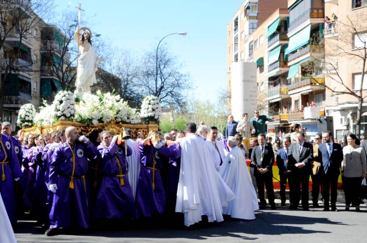 A continuación, los dos pasos han proseguido el recorrido por la Avda. Dos de Mayo, Plaza del Pradillo, donde ha tenido lugar la celebración de la Misa de Pascua de Resurrección a las 12 horas, tras la cual las imágenes ha continuado su recorrido