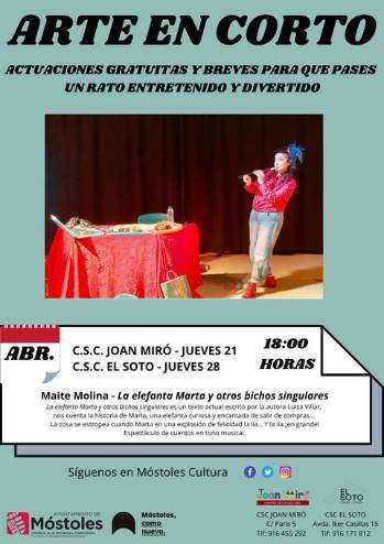 El próximo jueves 21 de abril en el Centro Sociocultural Joan Miró arranca la temporada de primavera del programa "Arte en corto" que organiza la Concejalía de Seguridad, Convivencia, Cultura y Transición Ecológica. Se presenta un espectáculo de cuentos en tono musical "La Elefanta Marta y otros Bichos Singulares", a cargo de Maite Molina. Un paseo por la literatura infantil moderna, donde distintos animales nos cuentan sus emociones y experiencias a veces disparatadas a través de cuentos orales tradicionales. La representación se repetirá en el Centro Sociocultural El Soto el día 28 de abril. Como es habitual las actuaciones se llevarán a cabo los jueves alternos de cada mes, a las 18: 00 h.