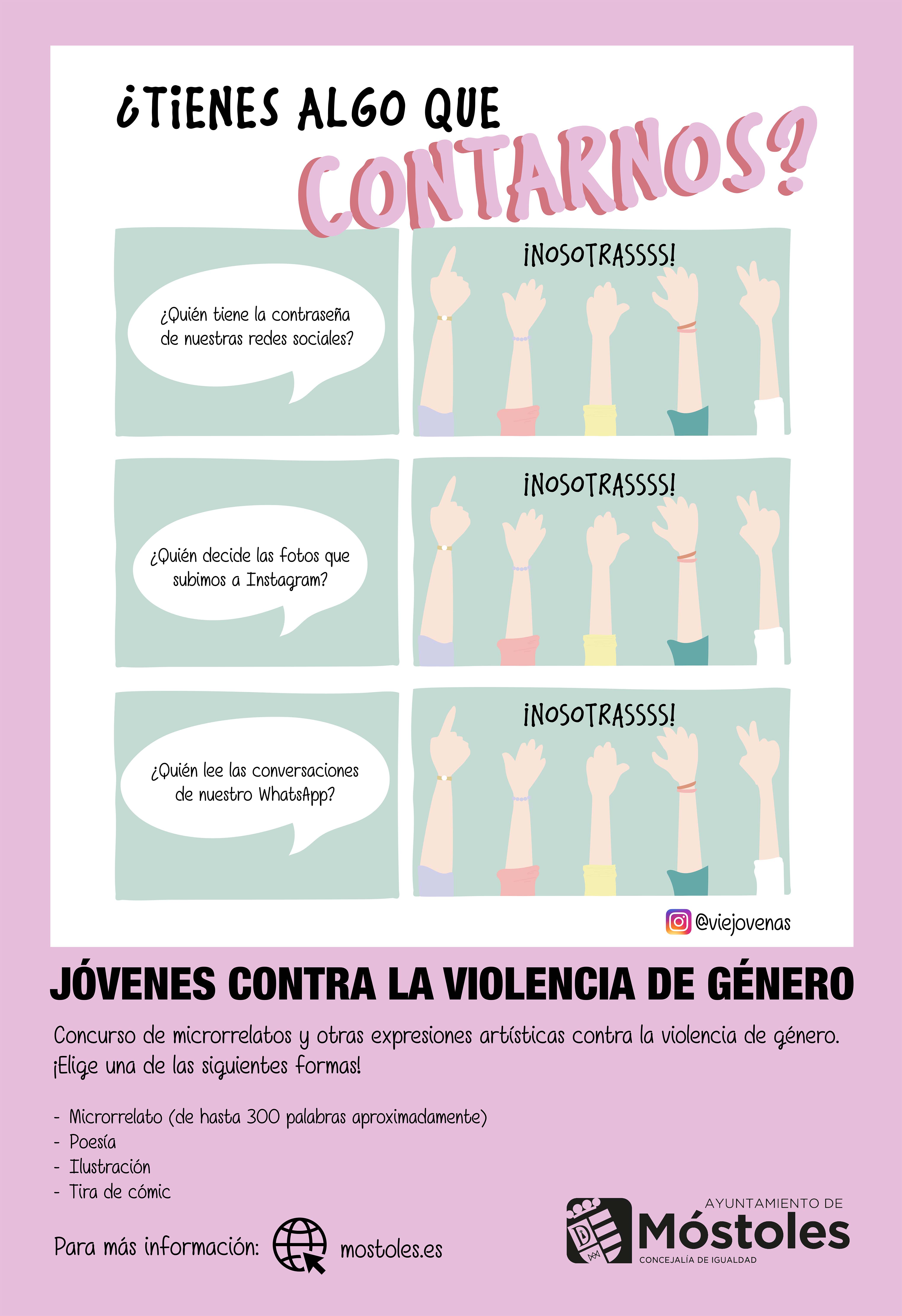 CARTEL TAMAÑO REAL peqCARTEL TAMAÑO REAL peqEl Gobierno de Móstoles, a través de la Concejalía de Igualdad, convoca un concurso de microrrelatos e ilustraciones contra la violencia de género. La iniciativa, dirigida a las alumnas y alumnos de los centros públicos de Educación Secundaria, Bachillerato y Formación Profesional de Móstoles, se enmarca en la campaña de prevención y sensibilización contra la violencia machista que el Ayuntamiento organiza en torno al 25 de noviembre, Día Internacional para la Erradicación de la Violencia contra las Mujeres.