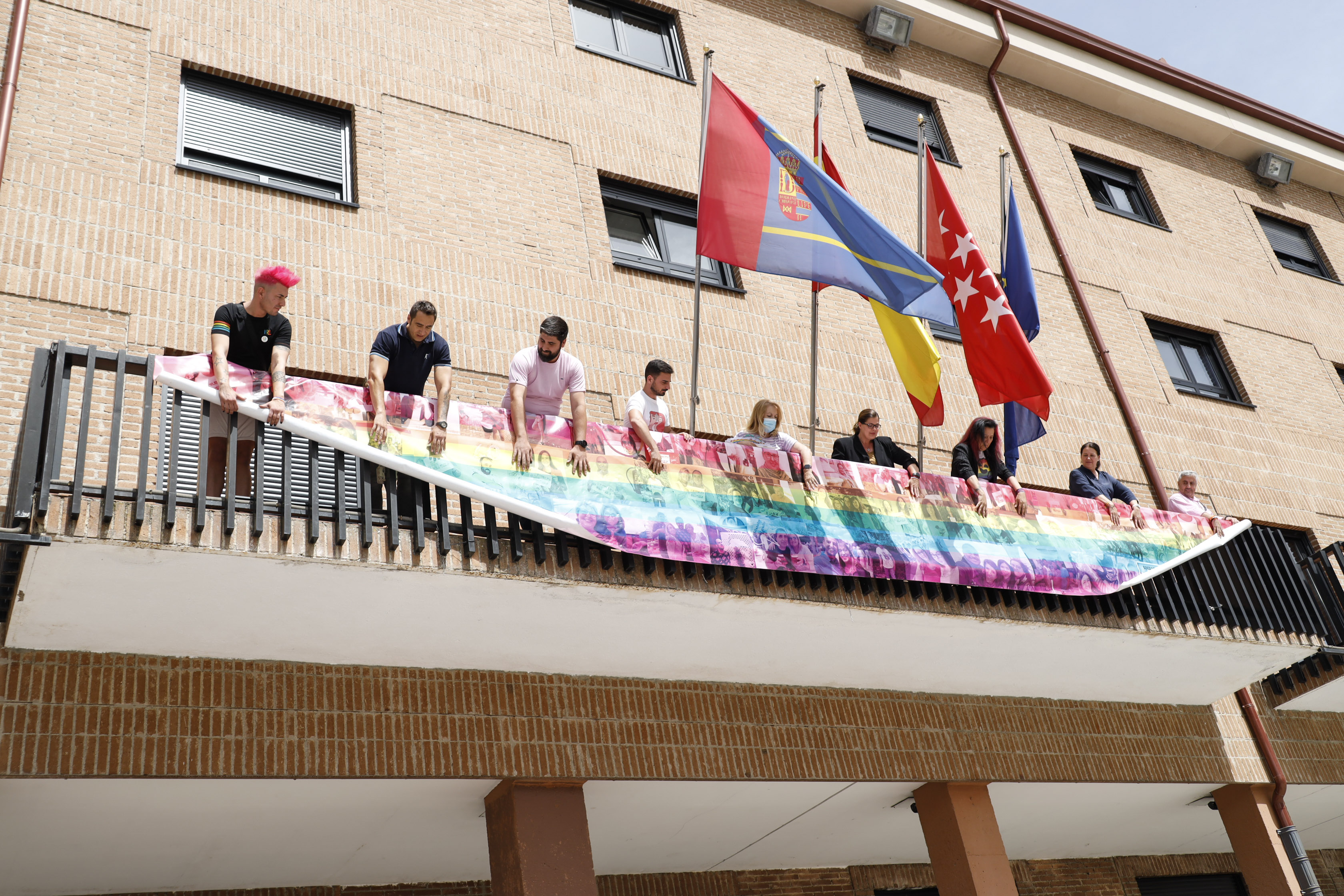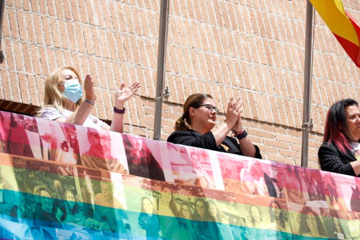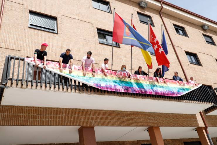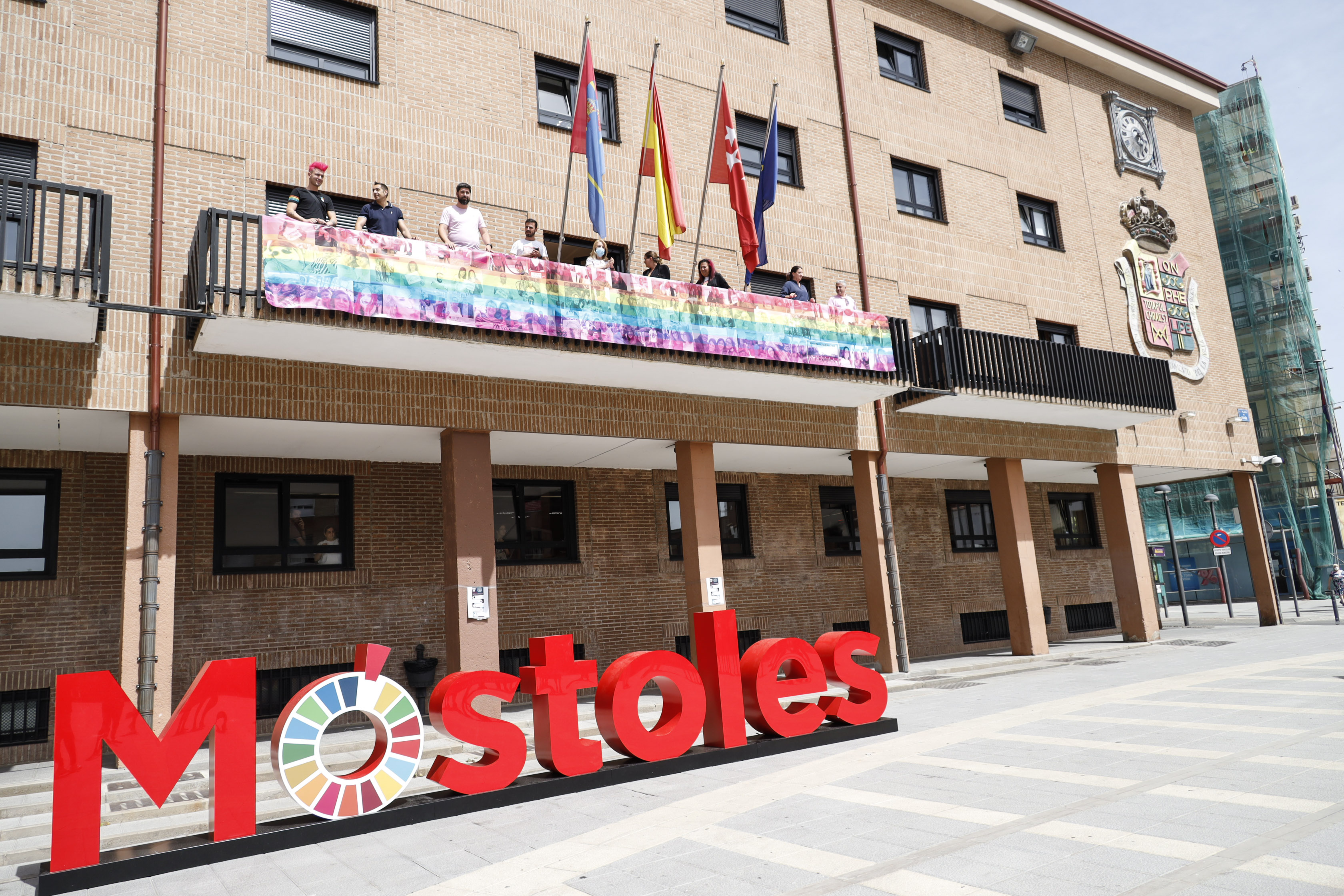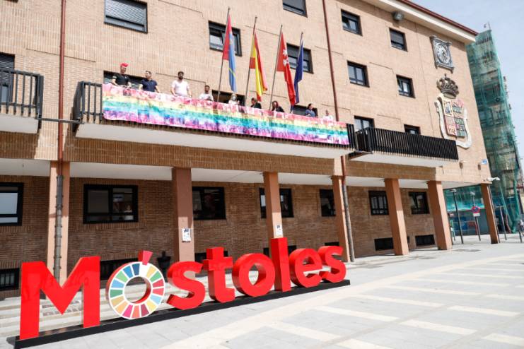 El balcón del Ayuntamiento de Móstoles luce ya la pancarta en apoyo al colectivo LGTBI