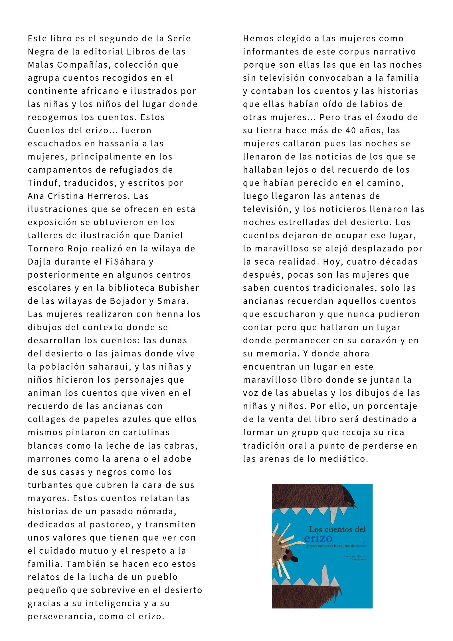 Promovida por la Comunidad de Madrid, en colaboración con la Concejalía de Cultura y Políticas Medio Ambientales, se trata de una muestra compuesta por ilustraciones originales realizadas por Daniel Tornero junto con las niñas y niños de los campamentos de refugiados saharauis, basadas en los cuentos escuchados y escritos por Ana Cristina Herreros.