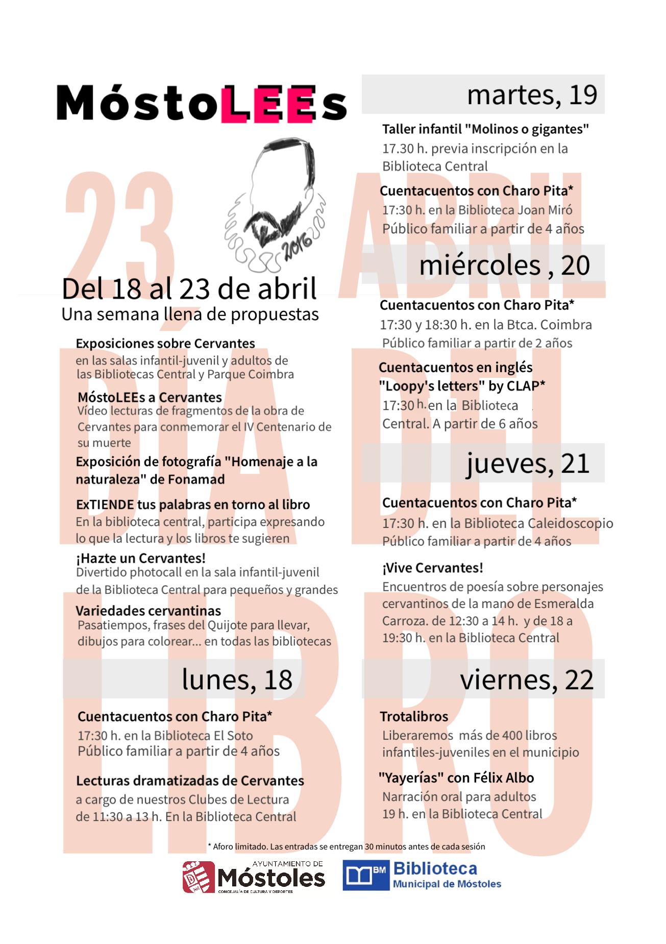 Con motivo del Día del Libro, el próximo 23 de abril, durante la semana del 18 al 23 de abril, la Biblioteca Municipal de Móstoles ha organizado un amplio programa de actividades culturales dirigidas a todos los públicos. El objetivo de esta iniciativa de la Concejalía de Cultura y Deportes, es acercar el libro, la lectura y los servicios de la Biblioteca a todos los vecinos y vecinas del municipio.