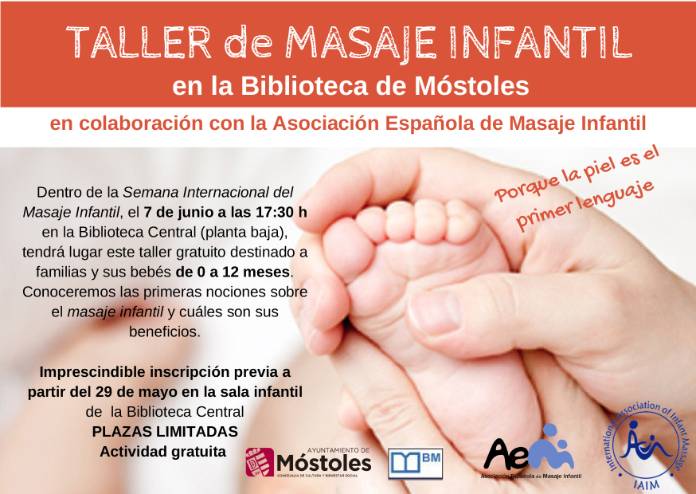 Imagen en alta resolución. Este enlace se abrirá mediante lightbox, puede haber un cambio de contextoLa Biblioteca Central de Móstoles ha organizado para el día 7 de junio, a las 17.30 horas, un Taller gratuito de Masaje infantil, en colaboración con la Asociación Española de Masaje Infantil.