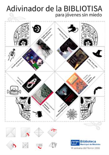 Así mismo, para aquellos usuarios que deseen dejarse sorprender con "terroríficas" recomendaciones literarias, se ha habilitado en el blog de la Biblioteca el `Adivinador de la Bibliotisa´, aplicación desde la cual los interesados que lo deseen pueden descargarse tres modelos diferentes, uno para niños y niñas valientes, otro para jóvenes sin miedo y, por último, otro para todos los que disfruten con una buena historia de terror. El enlace es: https://bibliotecademostoles.wordpress.com/2016/10/27/vi-semana-del-terror-especial-brujas-brujos-y-brujeria/