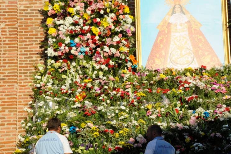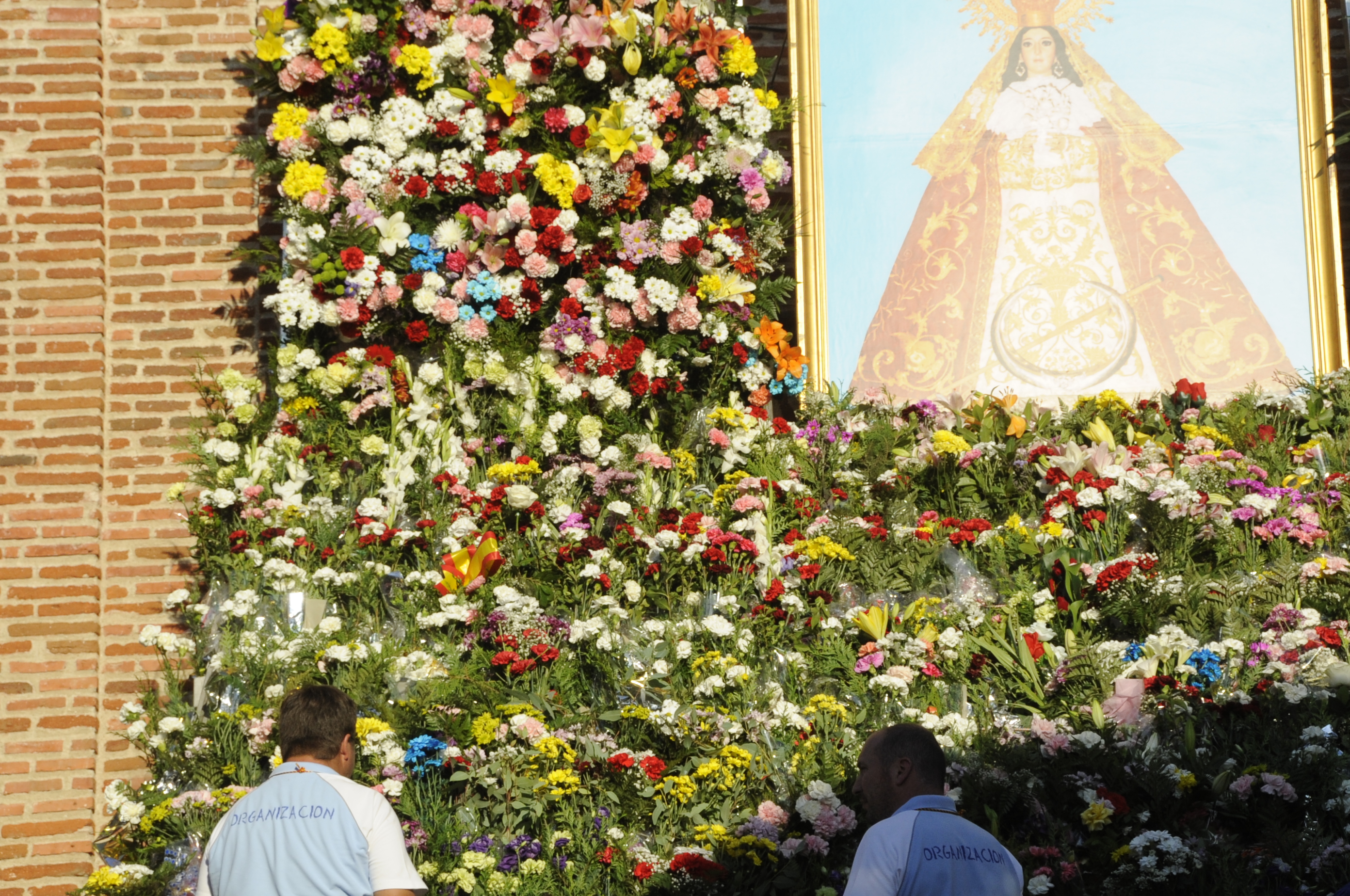 Cerca de 2.000 ramos de flores conforman un tapiz multicolor rodeando el retablo de la Patrona de Móstoles