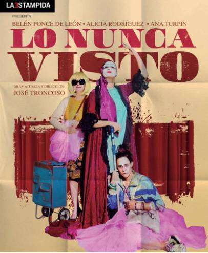 Lo nunca visto presenta a una decrépita profesora de danza y teatro para niñas, quien, a un mes del cierre por impagos de su estudio, decide que es el momento del «ahora o nunca"y realiza un espectáculo que revolucione el arte contemporáneo: Lo nunca visto. Sin talento, sin dinero y ya sin alumnas en sus clases, se lanza a reclutar a "artistas comprometidos" para su causa. Sólo acudirán a su llamada dos de sus exalumnas: una yonki gallega y un ama de casa recién fugada. La entrega en cuerpo y alma de nuestras tres protagonistas, que no tienen otra cosa que contarnos más que sus propias vidas, nos pondrá el listón muy alto, haciéndonos bailar de llanto y reír de sudor. Empieza la función.