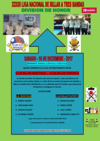 PARTIDO PAIPORTA 3Imagen en alta resolución. Este enlace se abrirá mediante lightbox, puede haber un cambio de contextoPARTIDO PAIPORTA 3El sábado 16 de diciembre se disputa la quinta jornada de la Liga Nacional de billar a tres bandas en División de Honor, en la que el Club Billar Móstoles recibe al Club Billar Paiporta, Campeón de España y actual líder de la clasificación. Se trata de un partido trascendental para las aspiraciones de ambos clubes, ya que se enfrentan primero y segundo clasificado. Los partidos serán retransmitidos en directo por La Liga4Sports. Desde el Club mostoleño se anima a los aficionados a que acompañen a sus jugadores en un día tan importante.