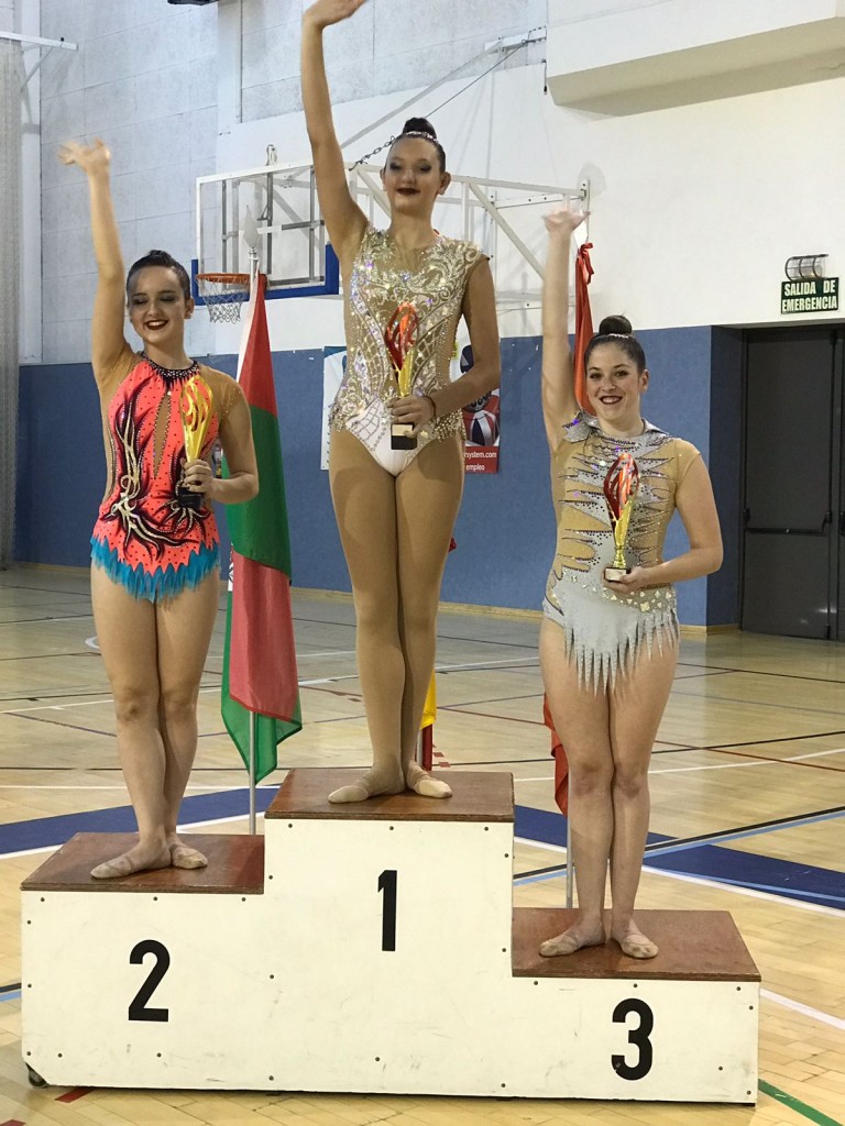En la categoría senior A, competía el equipo P, que la semana pasada conseguía su clasificación para el Campeonato de España Individual y Clubes que se celebrará a finales del mes de Junio. El equipo no pudo competir al completo, ya que Paula Lopez de Pablo tuvo que ser baja en el último momento debido a molestias en una rodilla que estamos seguros muy pronto se recuperará. Laura Andrinal, con pelota, hizo un buen ejercicio, con algunos fallos que seguro mejoraremos para la próxima cita. Aún así, Laura se hizo con la tercera posición en su categoría. Andrea López de Pablo, por su parte, realizó un entero bastante bueno, con alguna imprecisión fruto de las últimas modificaciones del ejercicio realizadas esta semana. A pesar de ello, Andrea se hizo con la primera posición en su categoría consiguiendo la medalla de oro.