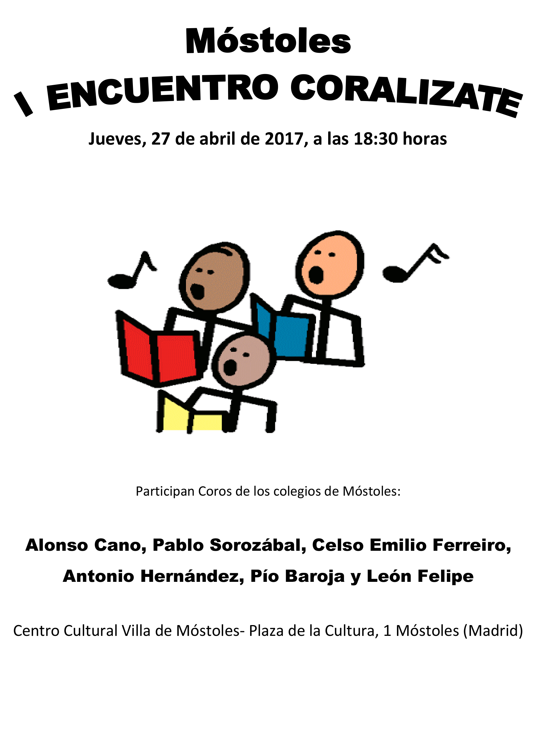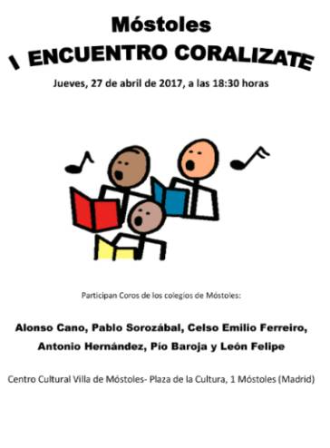Imagen en alta resolución. Este enlace se abrirá mediante lightbox, puede haber un cambio de contextoEl Teatro del Centro Sociocultural Villa de Móstoles reunirá, el próximo jueves 27 de abril a las 18:30 horas, a seis coros escolares para realizar una muestra coral infantil que supone el Encuentro programado dentro del Proyecto "Coralízate", subvencionado por la Concejalía de Educación del Ayuntamiento de Móstoles, al igual que otros Proyectos de Innovación Educativa realizados en otros centros.