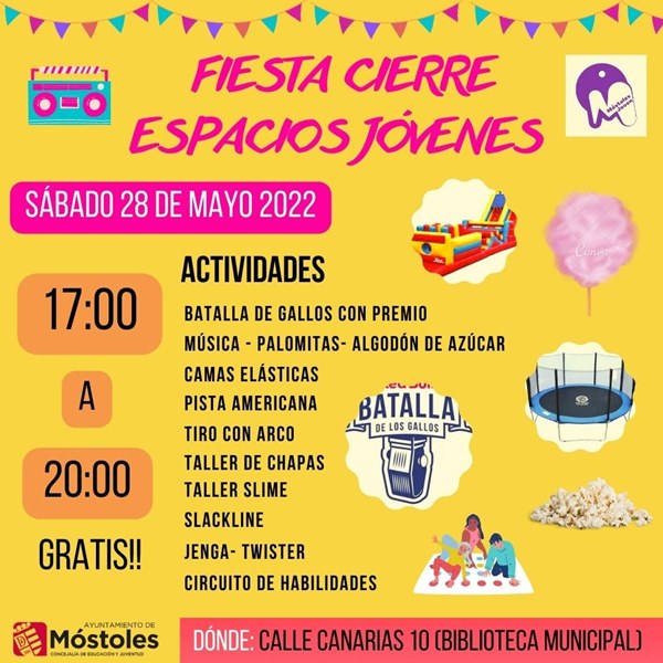 Por este motivo tendrá lugar, desde las 17:00 h hasta las 20:00 h, una fiesta fin de temporada en la calle Canarias, 10 (junto a la Biblioteca Central), donde los adolescentes podrán disfrutar de batallas de gallos con premios, camas elásticas, pista americana, tiro con arco, taller de chapas, circuito de habilidades, taller de slimer y un slackline, entre otras atracciones. Las actividades son gratuitas y no es necesario inscripción previa.