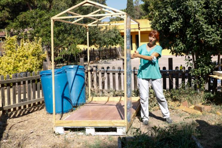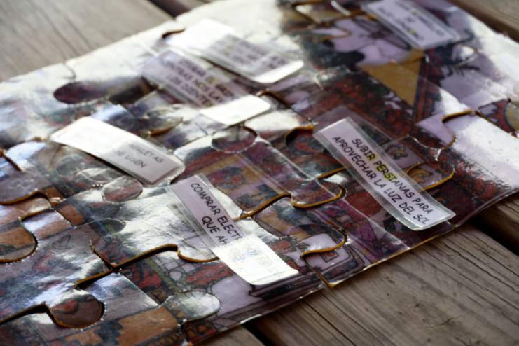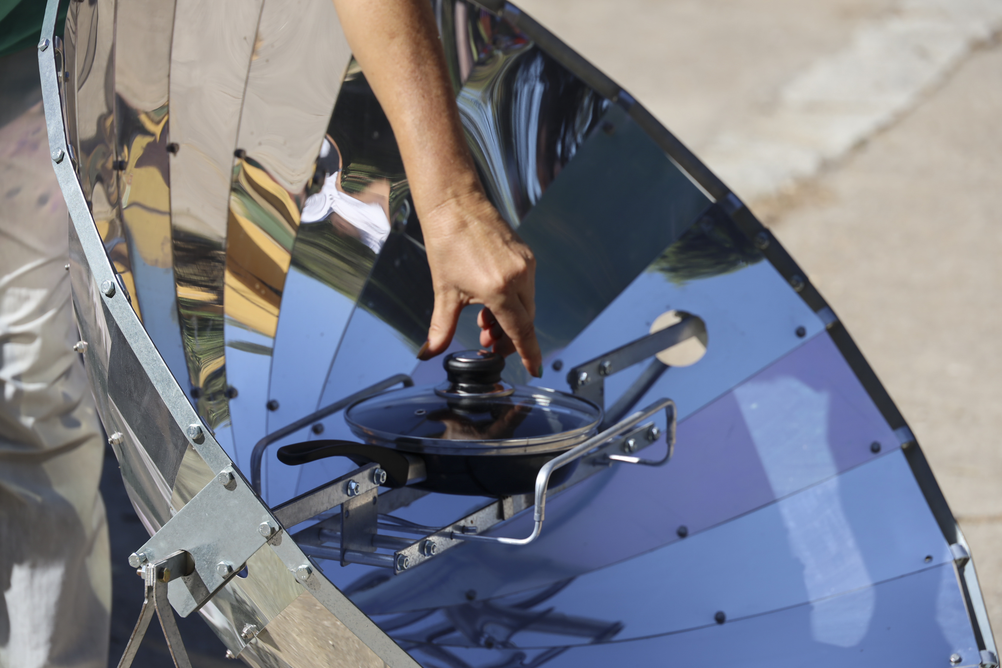 Después, en la parte práctica se muestran diferentes proyectos realizados con energía solar, como una ducha, una cocina solar, etc. y se realizan diferentes experimentos relacionados con la temperatura. Dentro del taller de manualidades, las familias han construido su propio horno solar con una caja de zapatos.