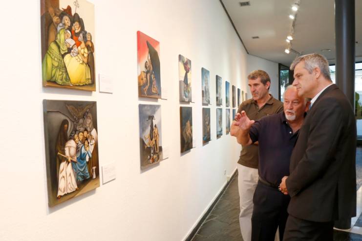 David Lucas, alcalde de Móstoles, y Agustín Martín, concejal de Cultura, Festejos y Deportes, han asistido esta mañana a la visita guiada ofrecida por los artistas Mónica Rubiños y Francisco Manuel Guijjarro, a través de sus propuestas expositivas "Nuevo origen" y "Los caprichos", en el Centro Cultural Villa de Móstoles.