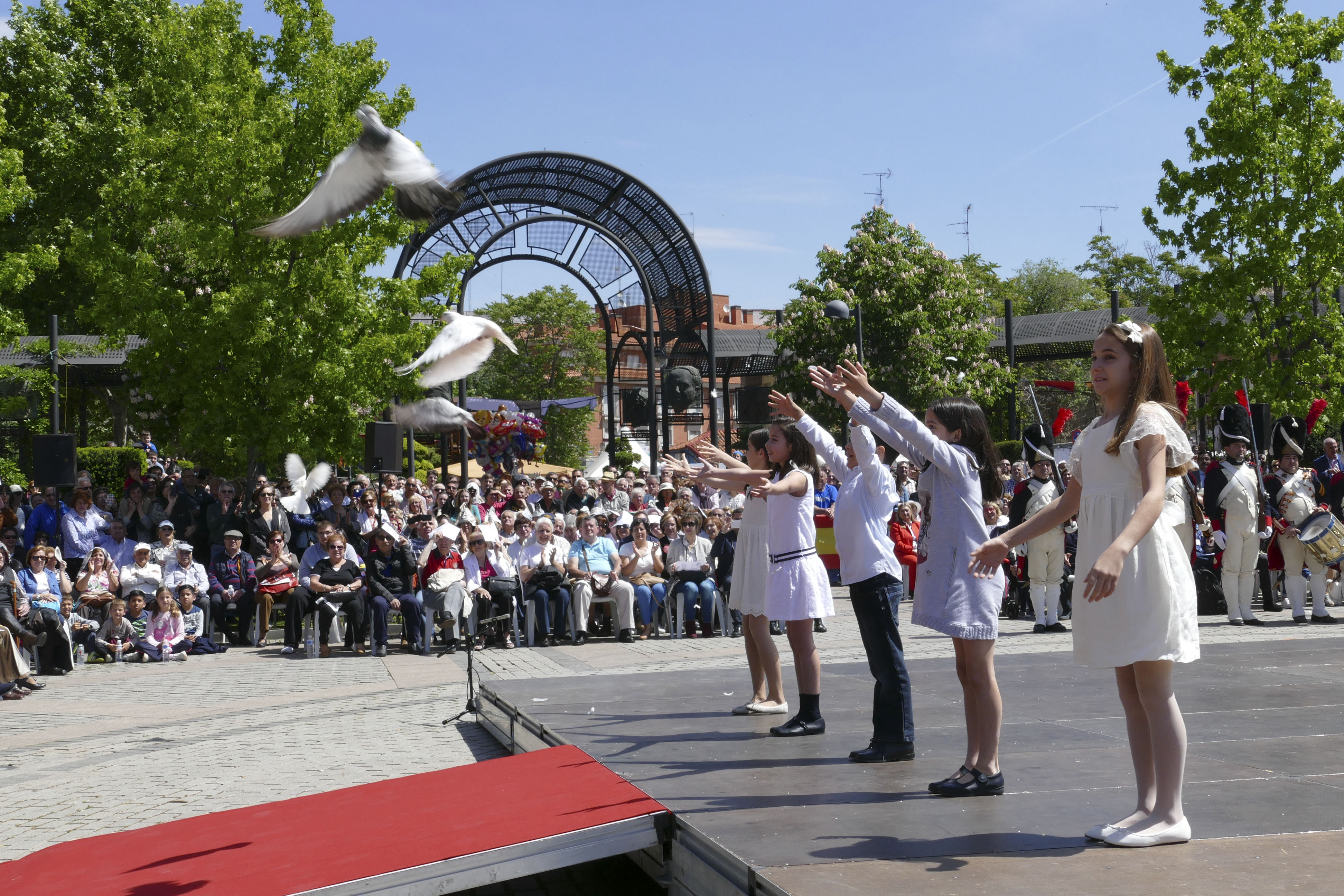 La mañana ha contado, además, con dos actuaciones de las alumnas y alumnos de la Escuela de Danza `Rojas y Rodríguez´ de la localidad. También se han entregado los Premios Mostoleños 2017 y ha tenido lugar la tradicional suelta de palomas, con el fin de trasmitir un mensaje de esperanza e ilusión de futuro.