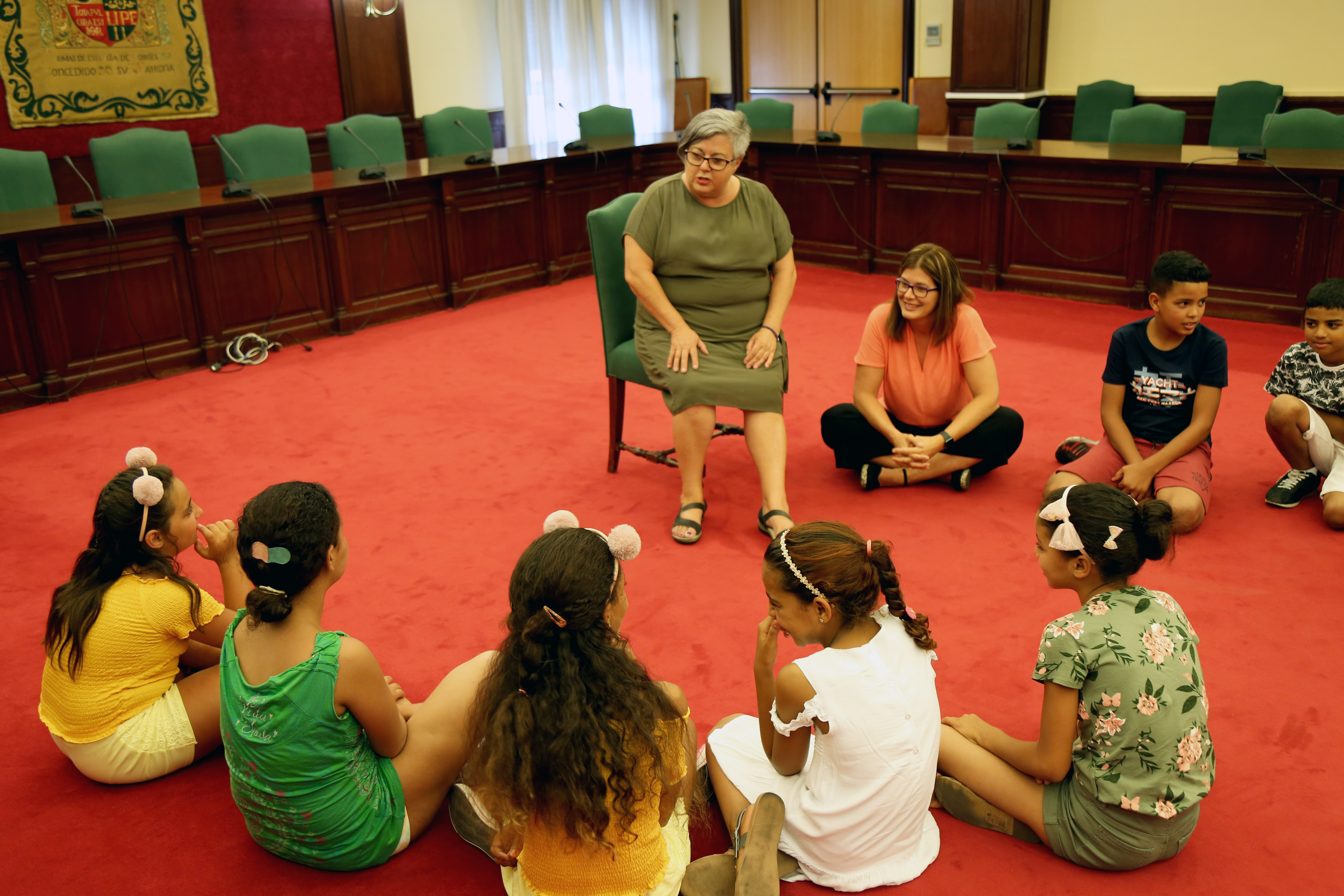 principal_pImagen en alta resolución. Este enlace se abrirá mediante lightbox, puede haber un cambio de contextoprincipal_pUna decena de niñas y niños saharauis que pasarán este verano en Móstoles, en el marco del programa "Vacaciones en Paz", compartieron ayer charla con la alcaldesa, Noelia Posse, y la concejala de Igualdad, Beatriz Benavides, que les ofrecieron una informal y cariñosa bienvenida en el Salón de Plenos del Ayuntamiento.