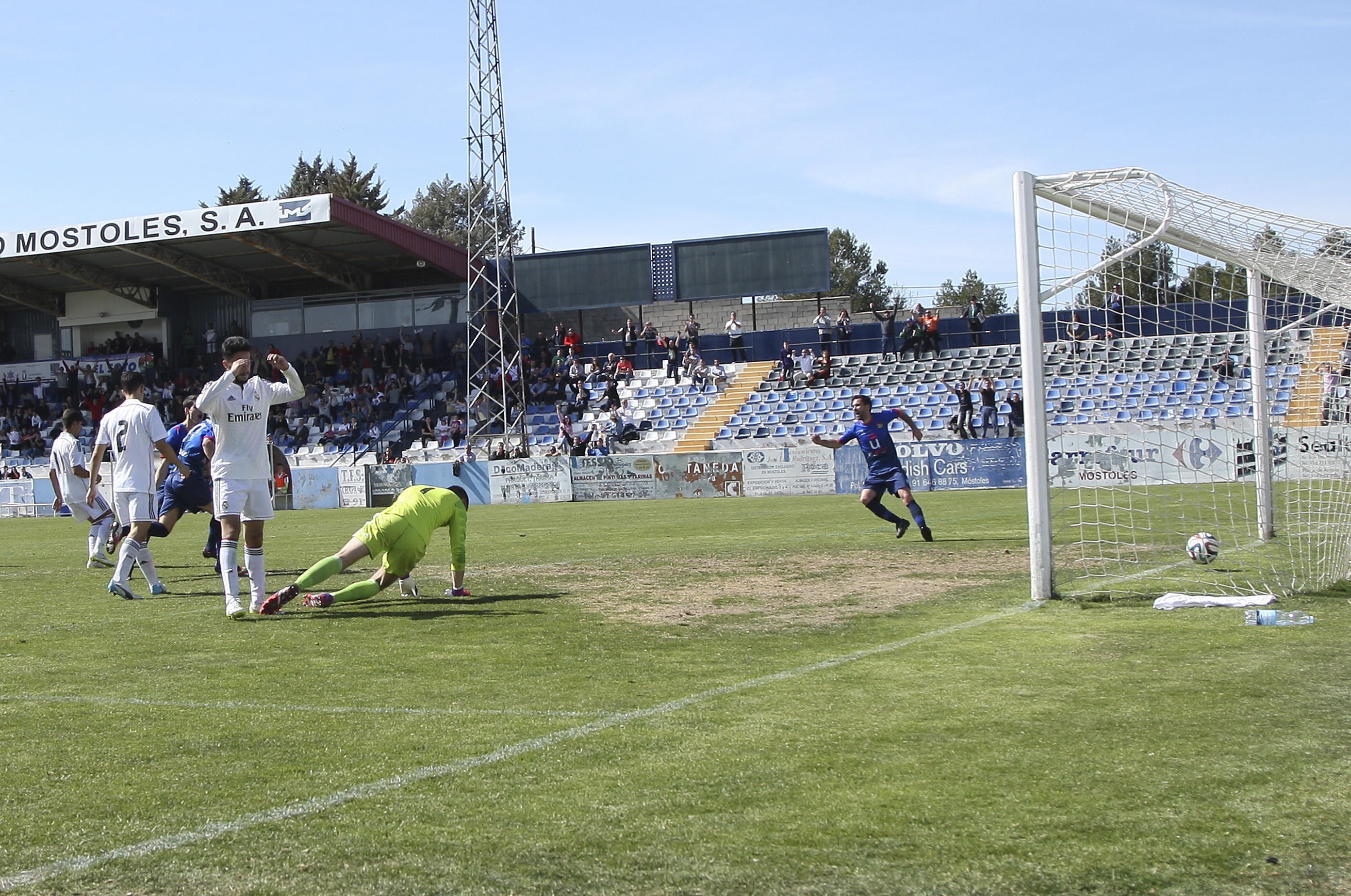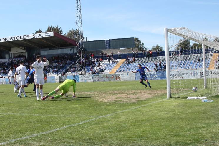 El encuentro tuvo varios guiones, primero fue el penalti fallado en el minuto 5 de juego por Nachete, ante una buena intervención de Ander, ocasión clara de adelantarse en el marcador que los de Michel desaprovecharon. Acto seguido el filial blanco bien dirigido por Gay, comenzó a mandar en el juego, controlando el balón pero sin peligro sobre el marco defendido de manera efectiva por Amaro. En el minuto 25 el Móstoles, comienza a funcionar mucho mejor, controlando el partido hasta el final de los primeros 45 minutos de juego. Tras el descanso y con el (0-0) en el marcador, los de Michel aprietan a su rival, y llegan con peligro sobre la portería del Real Madrid, hasta que en el minuto 81, Moha, en una brillante jugada personal, marca el 1-0, de tiro raso ajustado al palo izquierdo del marco de Ander. Minutos más tarde en el 87´, Gonzalo de penalti pone el 2-0, con festival de tarjetas rojas del colegiado Torres Carrión, para Raimon, Victor y Gonzalo, (12 amarillas y 3 rojas en total). Actuación que no afectó en el resultado, para que el CD Móstoles URJC, se hiciera con una justa victoria por 2 goles a 0, ante un gran equipo como es el filial blanco. De esta forma suma de tres valiosos puntos con opciones al play off de ascenso.