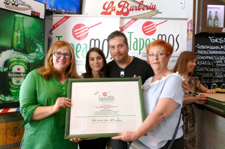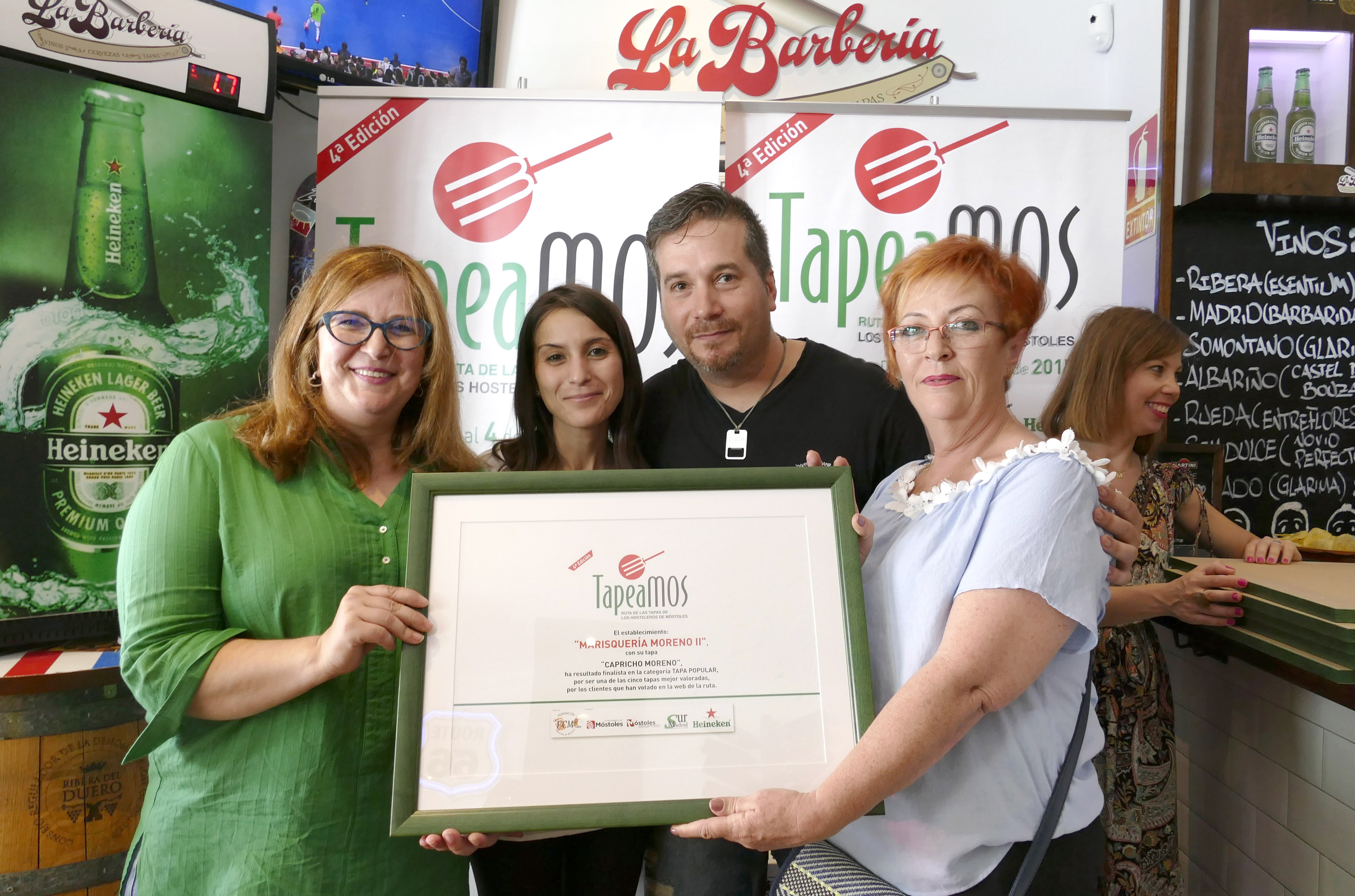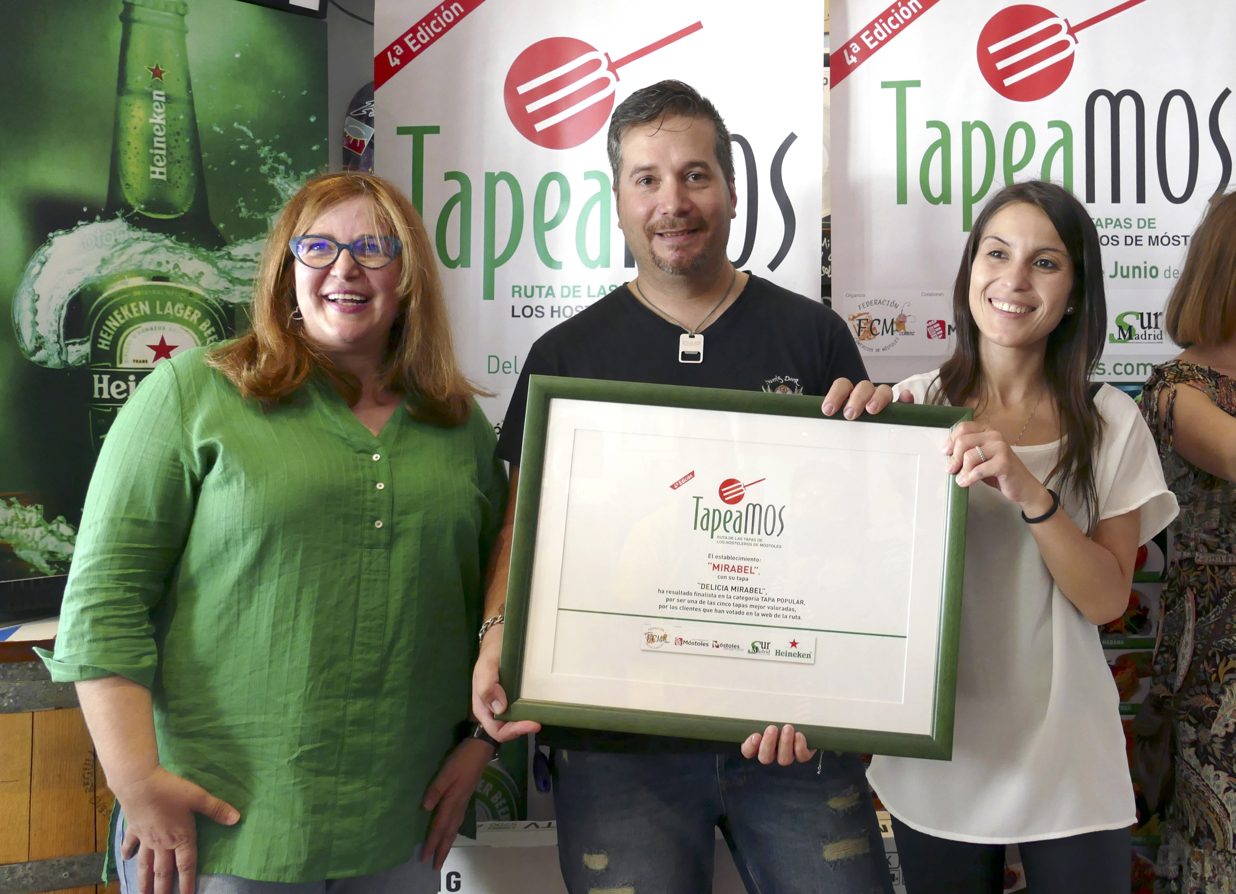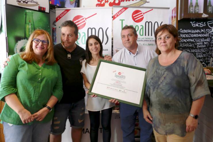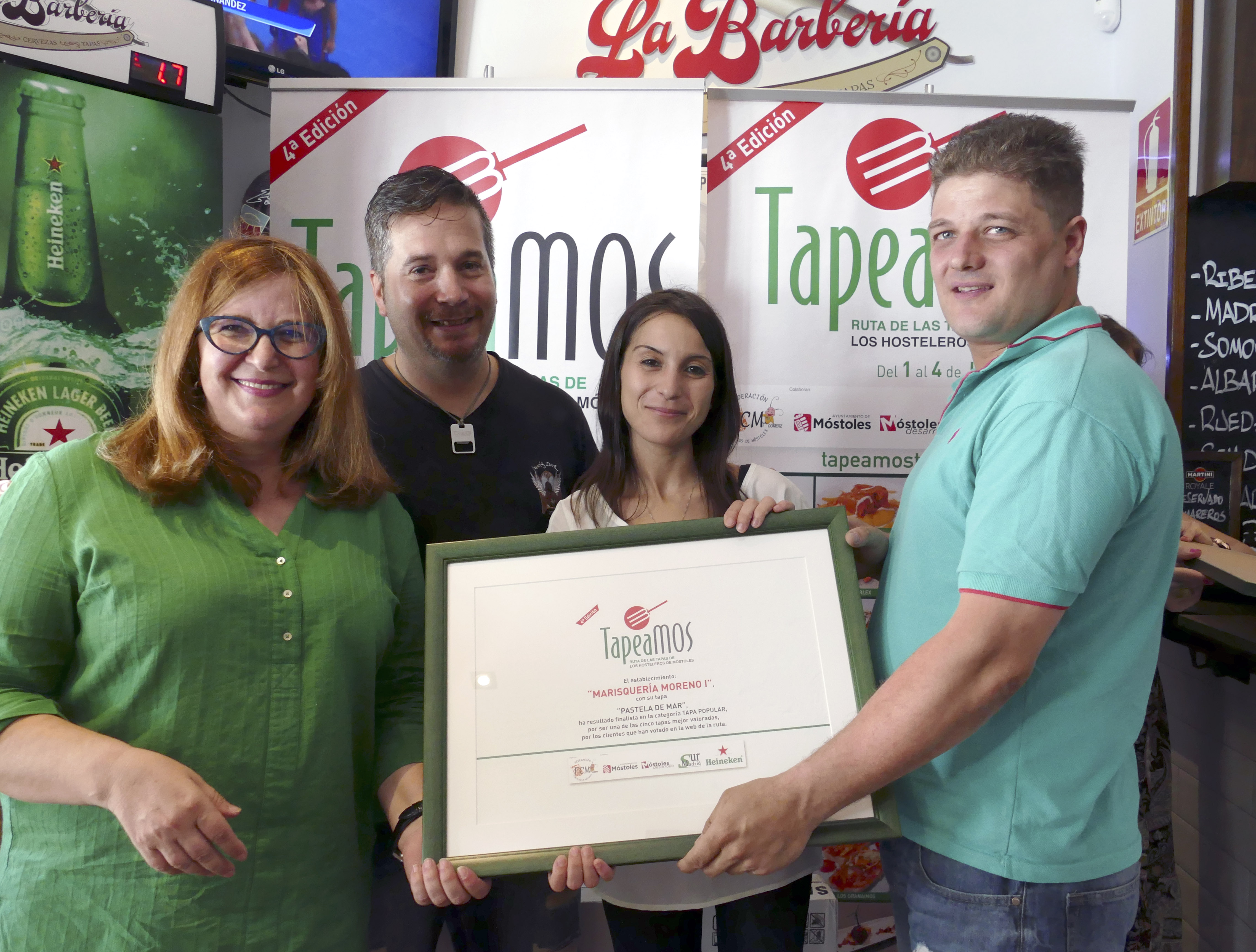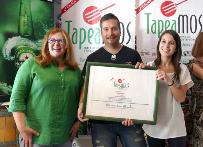 Entrega premios ruta de la tapa 1Imagen en alta resolución. Este enlace se abrirá mediante lightbox, puede haber un cambio de contextoEntrega premios ruta de la tapa 1Esta mañana se ha hecho la entrega de premios a los hosteleros ganadores de la cuarta edición de TapeaMOS, una iniciativa de la Federación de Comercios de Móstoles, con la colaboración del Ayuntamiento, a través de Móstoles Desarrollo, y con el patrocinio de Heineken y del medio local Sur Madrid cuyo objetivo es promocionar a las empresas de hostelería participantes e incentivar su actividad de restauración. A la entrega de premios, que se ha celebrado en La Barbería, ha asistido LA concejala de Desarrollo Económico, Empleo y Nuevas Tecnologías, Jessica Antolín; la presidenta de la Federación de Comerciantes de Móstoles, Chelo García; representantes de Heineken y de Sur Madrid, así como varios de los hosteleros participantes en la ruta.