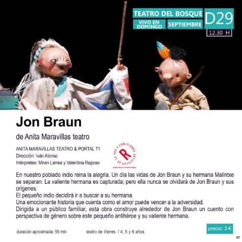 El sábado 28 de septiembre llegará "Comedia Aquilana", en el Teatro del Bosque a las 20 horas y el domingo 29, el espectáculo infantil "Jon Braun" a las 12 horas en el mismo teatro.
