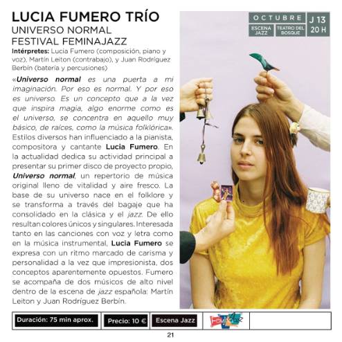 - Dentro del festival FeminaJazz, Lucía Fumero presentará el jueves 13 de octubre en el Teatro del Bosque su proyecto "Universo Normal", acompañada por Martín Leiton al contrabajo, y Juan Rodríguez Berbín a la batería y percusiones.