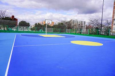 Además, se han pintado las pistas y marcado los campos de juego. Se han instalado nuevas porterías y canastas, y redes de fondo de nailon suspendidas en postes metálicos para la retención de los balones. El espacio contará también con elementos vegetales de carácter decorativo que el área de jardinería está plantando ya y con un área de esparcimiento canino con una fuente de dos alturas para las mascotas y sus dueños.