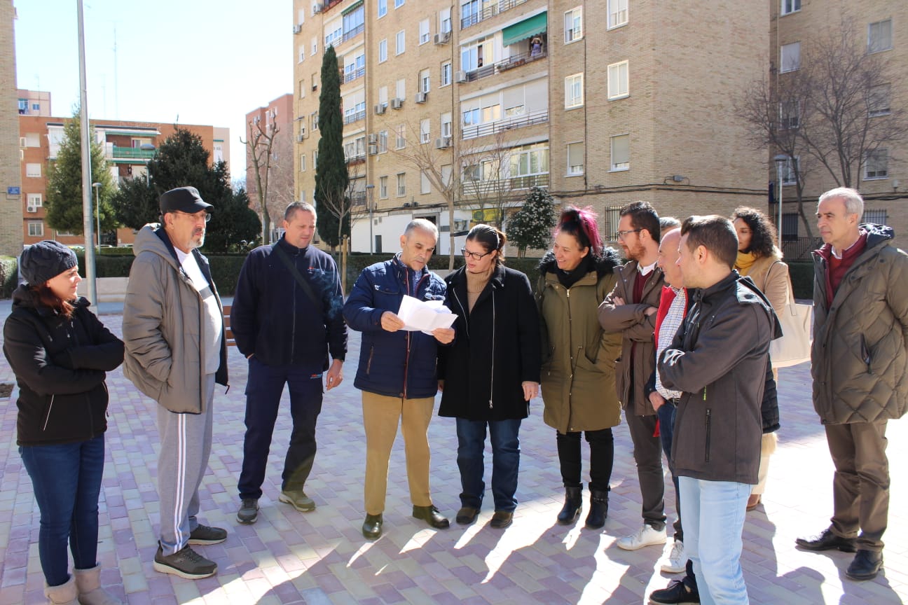 La Alcaldesa de Móstoles, Noelia Posse, acompañada por el Concejal de Mejora y Mantenimiento de la Ciudad, David Muñoz, y la portavoz de Podemos, Mónica Monterreal, ha visitado esta mañana la zona junto con el Presidente de la Asociación, Alonso Guijarro, y varios vecinos.