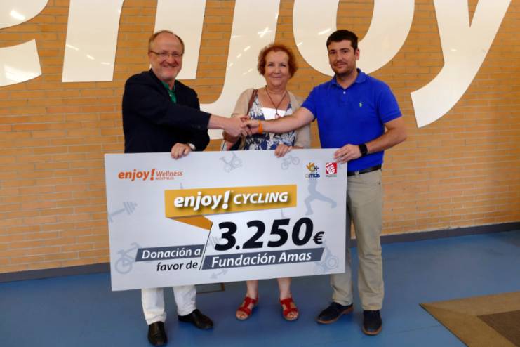 Donación a favor de Fundación AMÁSImagen en alta resolución. Este enlace se abrirá mediante lightbox, puede haber un cambio de contextoDonación a favor de Fundación AMÁSEsta mañana ha tenido lugar en el Gimnasio Enjoy el acto de entrega al Grupo AMAS de la recaudación obtenida el pasado mes de mayo en la celebración de la clase solidaria de spinning, que tuvo lugar en la Plaza de España. Entre los asistentes se encontraba la concejala de Sanidad, Igualdad y Mayores, Ana María Rodrigo y el director general del Grupo AMAS, Ismael Carrillo. Todo el dinero recaudado de las entradas, 3.250 euros, será destinado a promover el deporte de personas con discapacidad intelectual.