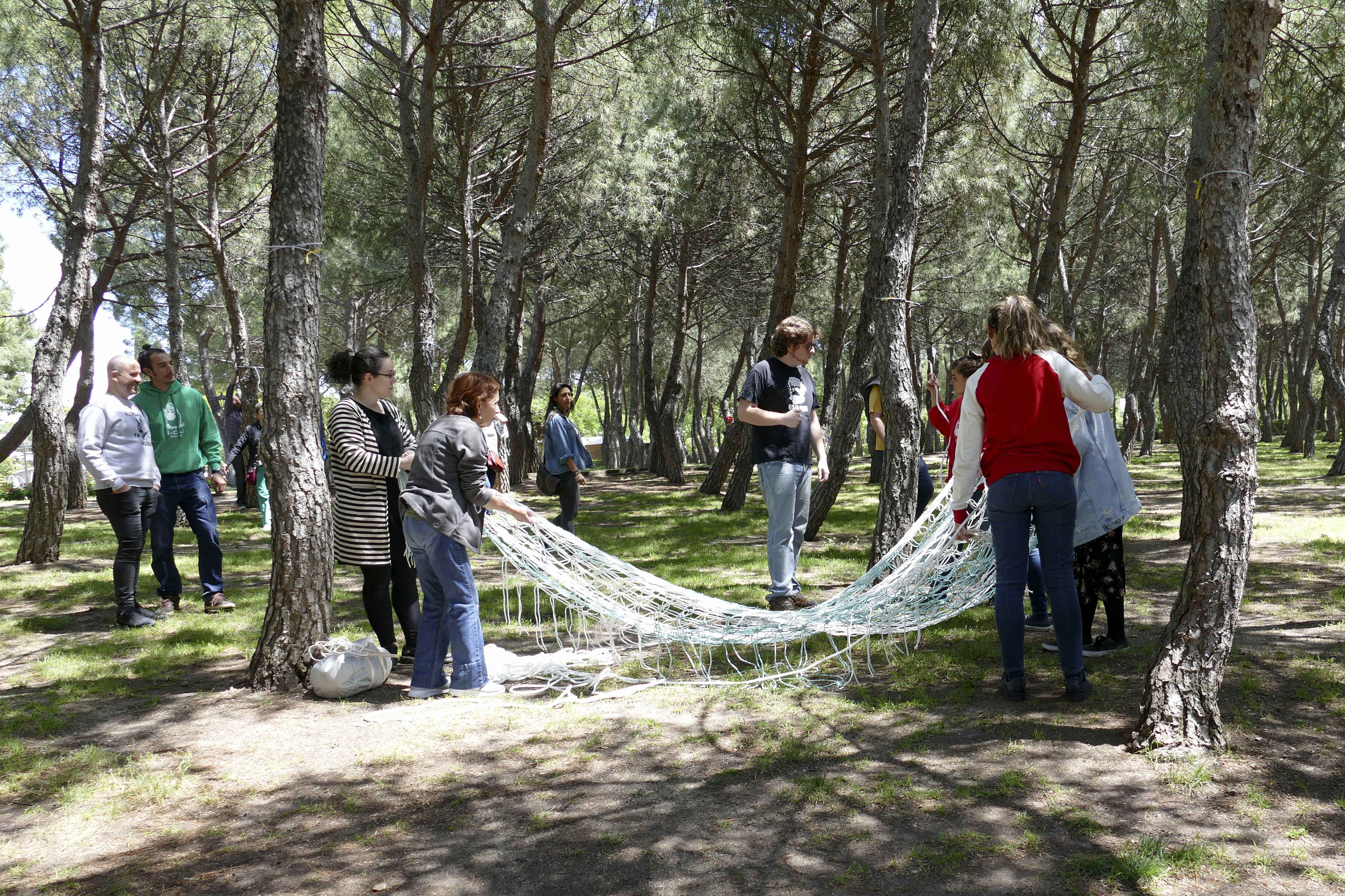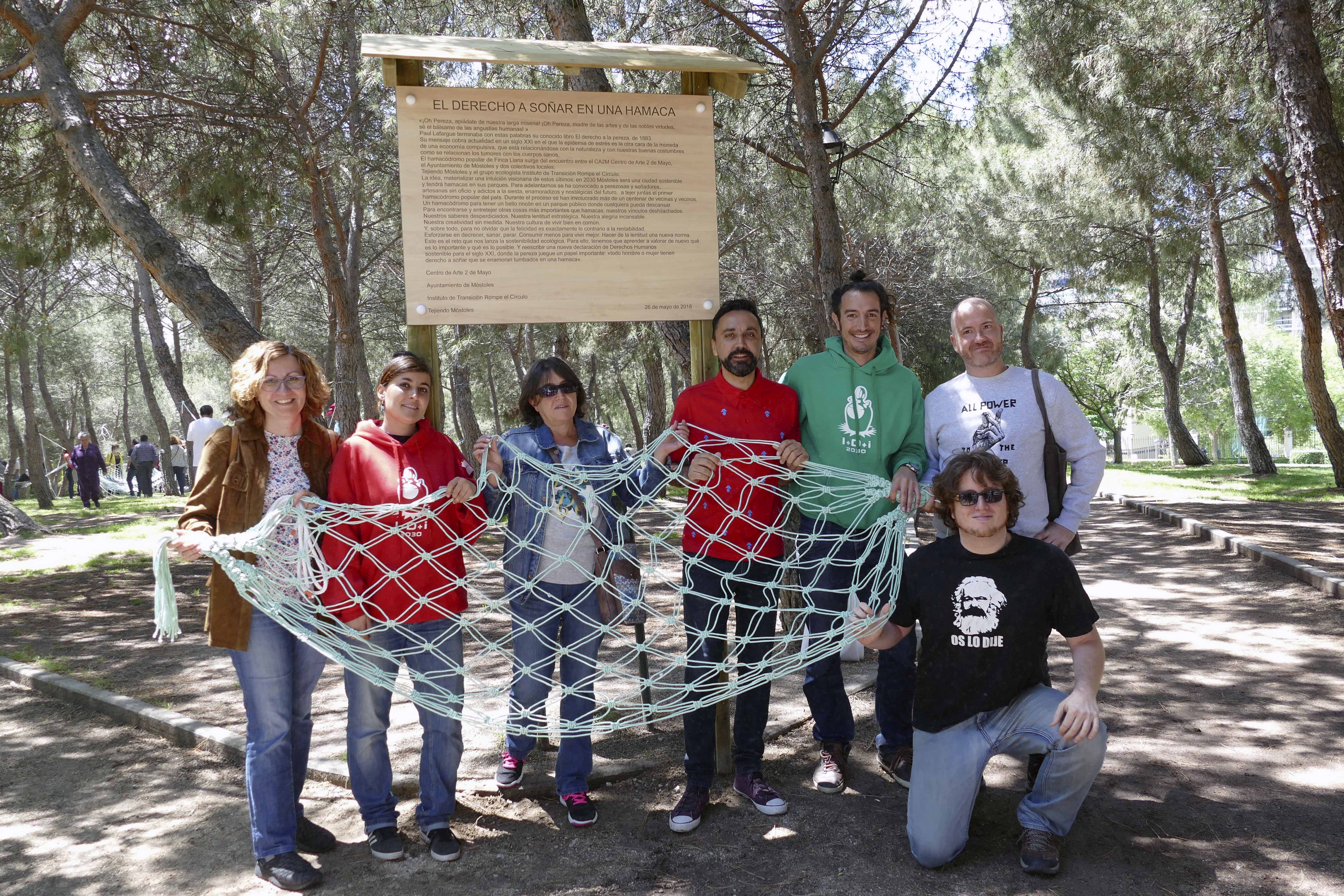 Un proyecto consistente en la elaboración de más de cuarenta hamacas a lo largo de los meses de marzo y abril de diversos talleres, públicos y participativos, en los cuales adultos, jóvenes y pequeños han podido compartir tiempo juntos y juntas mientras aprendían y tejían estos elementos que permanecerán instaladas en el parque durante los meses estivales para ser usados por los y las mostoleñas.