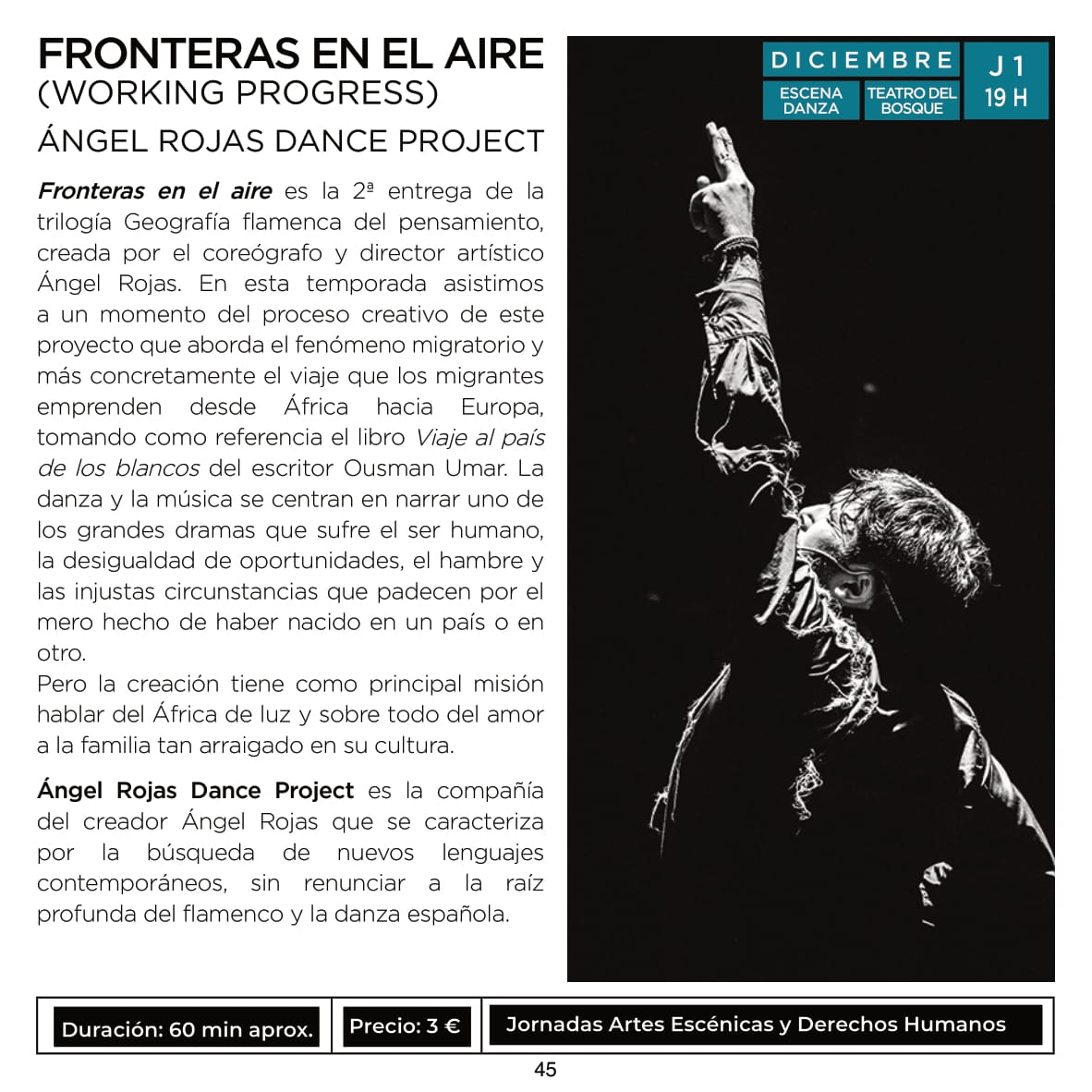 Dentro de la programación y enmarcada en las Jornadas de Artes Escénicas y Derechos Humanos", el jueves 1 de diciembre en el Teatro del Bosque, a las 19:00 h, se representará el espectáculo de danza y música "Fronteras en el aire (Working Progress)" a cargo de la compañía Ángel Rojas Dance Project.