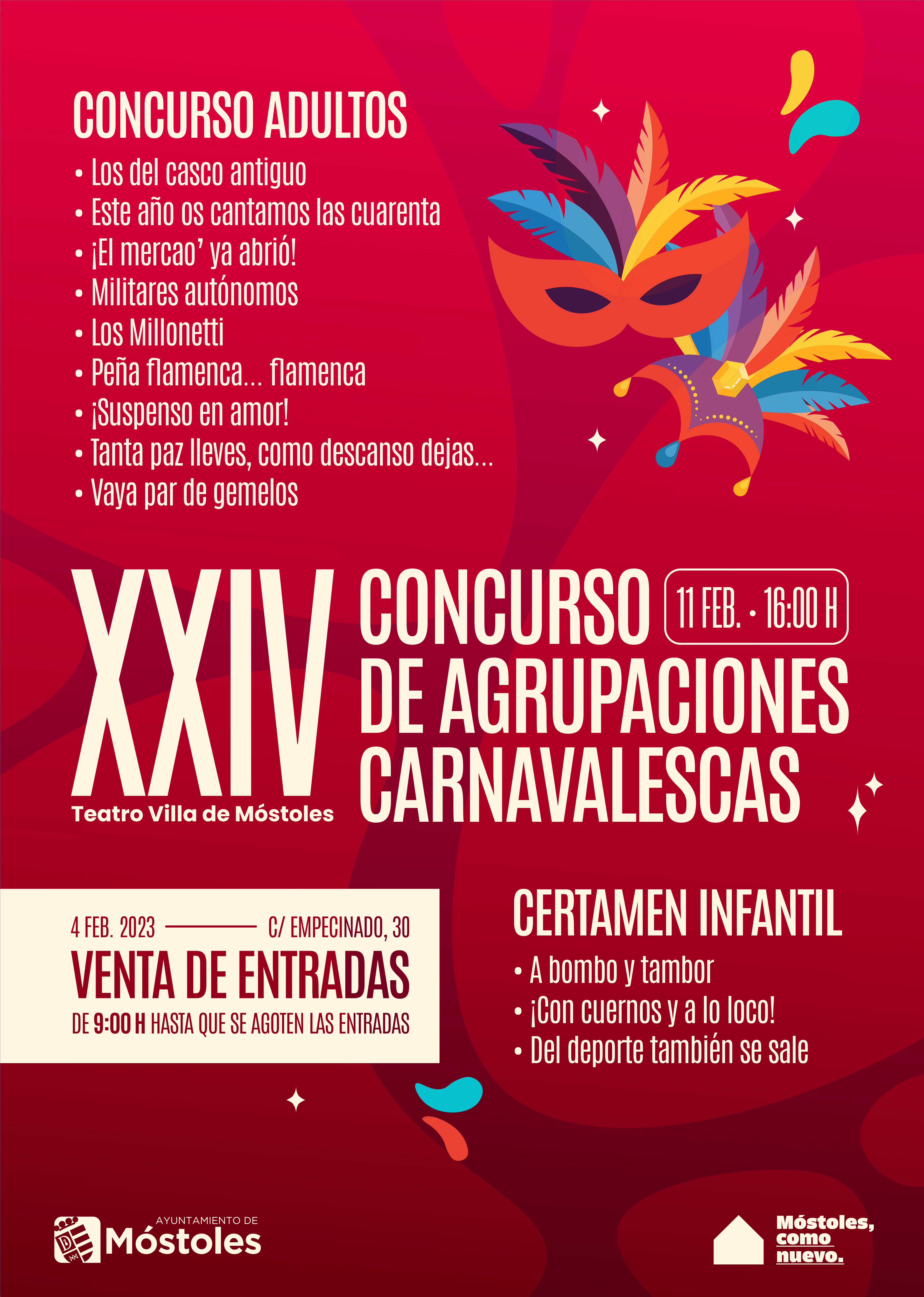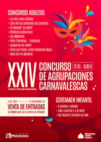 El XXIV Concurso de Agrupaciones Carnavalescas de Móstoles tendrá lugar el 11 de febrero a partir de las 16:00 h en el Teatro Villa de Móstoles. El certamen, que organiza el departamento de Festejos del Ayuntamiento y en el que este año compiten 9 agrupaciones de adultos y 3 infantiles, dará el pistoletazo de salida al programa de carnaval de este año.