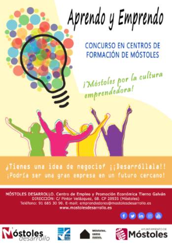 Las bases reguladoras del concurso "Aprendo y Emprendo" se encuentran publicadas en la página web www.mostolesdesarrollo.esEste enlace se abrirá en una ventana nueva. Más información en Móstoles Desarrollo, a través del teléfono 916853090 o directamente en sus dependencias sitas en la Calle Pintor Velázquez, 68 Edificio Tierno Galván, en horario de lunes a viernes, 9:00 h a 14:00 h.