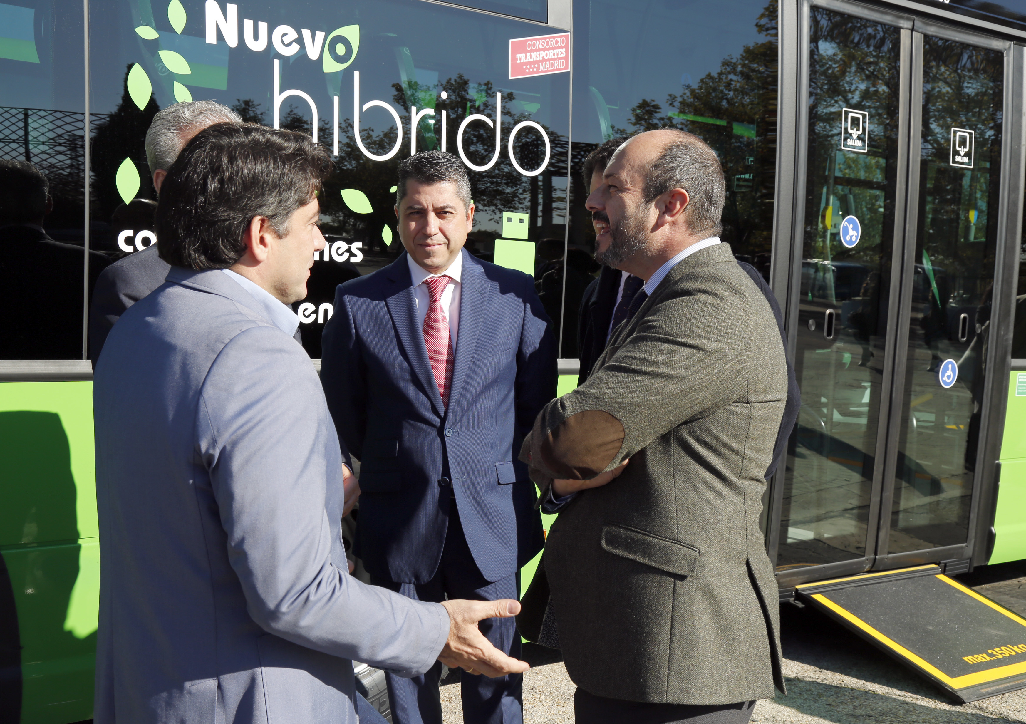 Imagen en alta resolución. Este enlace se abrirá mediante lightbox, puede haber un cambio de contextoEl municipio de Móstoles dispondrá de ocho nuevos autobuses híbridos de la flota interurbana, que han sido presentados esta mañana en un acto celebrado en Alcorcón, al que ha asistido el consejero de Transportes, Vivienda e Infraestructuras de la Comunidad de Madrid, Pedro Rollán y el concejal de Presidencia, Seguridad Ciudadana y Movilidad, Roberto Sánchez y la concejala de Obras, Infraestructuras, Mantenimiento de Vías Públicas y Festejos, Noelia Posse, en representación del Gobierno Municipal de Móstoles. Las nuevas unidades se han incorporado a las líneas 521 (Príncipe Pío – Móstoles) y 523 (Príncipe Pío – Móstoles- Villafontana).