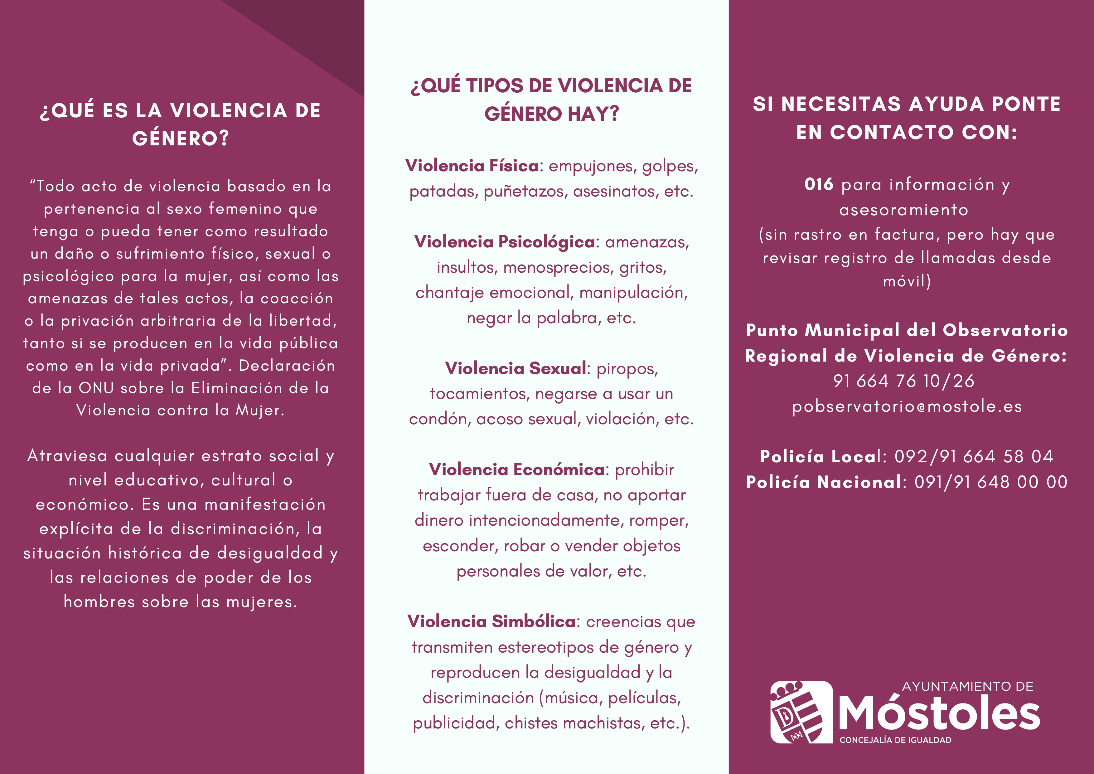 La Declaración de la ONU sobre la Eliminación de la Violencia contra las mujeres, la define como todo acto de violencia basado en la pertenencia al sexo femenino que tenga o pueda tener como resultado un daño o sufrimiento físico, sexual o psicológico, así como las amenazas de tales actos, la coacción o la privación arbitraria de la libertad en la vida pública o privada de la mujer. El Gobierno de Móstoles trabaja de modo transversal para hacer frente a la violencia de género, siendo una prioridad que se trabaja desde la prevención en diferentes áreas municipales.